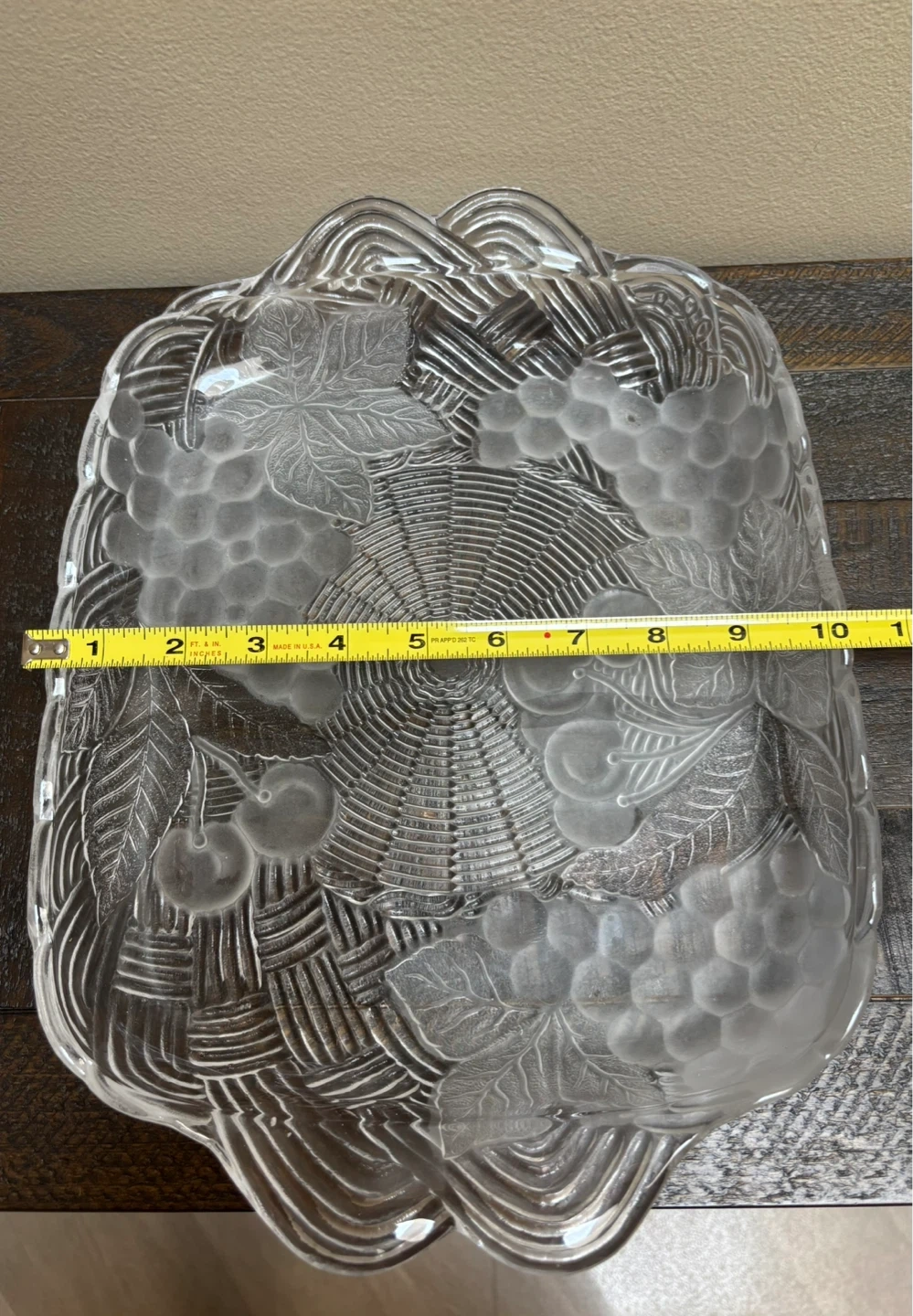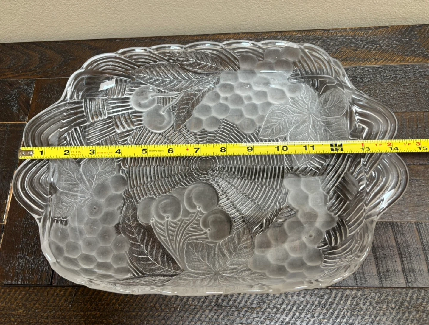 Selling a used vintage glass fruit serving platter! It features a beautiful grape and leaf design. Show few sign of wear & usage. But still in ok condition.