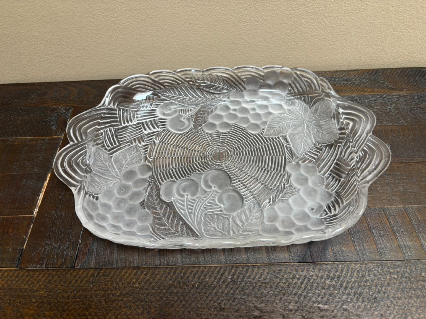 Selling a used vintage glass fruit serving platter! It features a beautiful grape and leaf design. Show few sign of wear & usage. But still in ok condition.