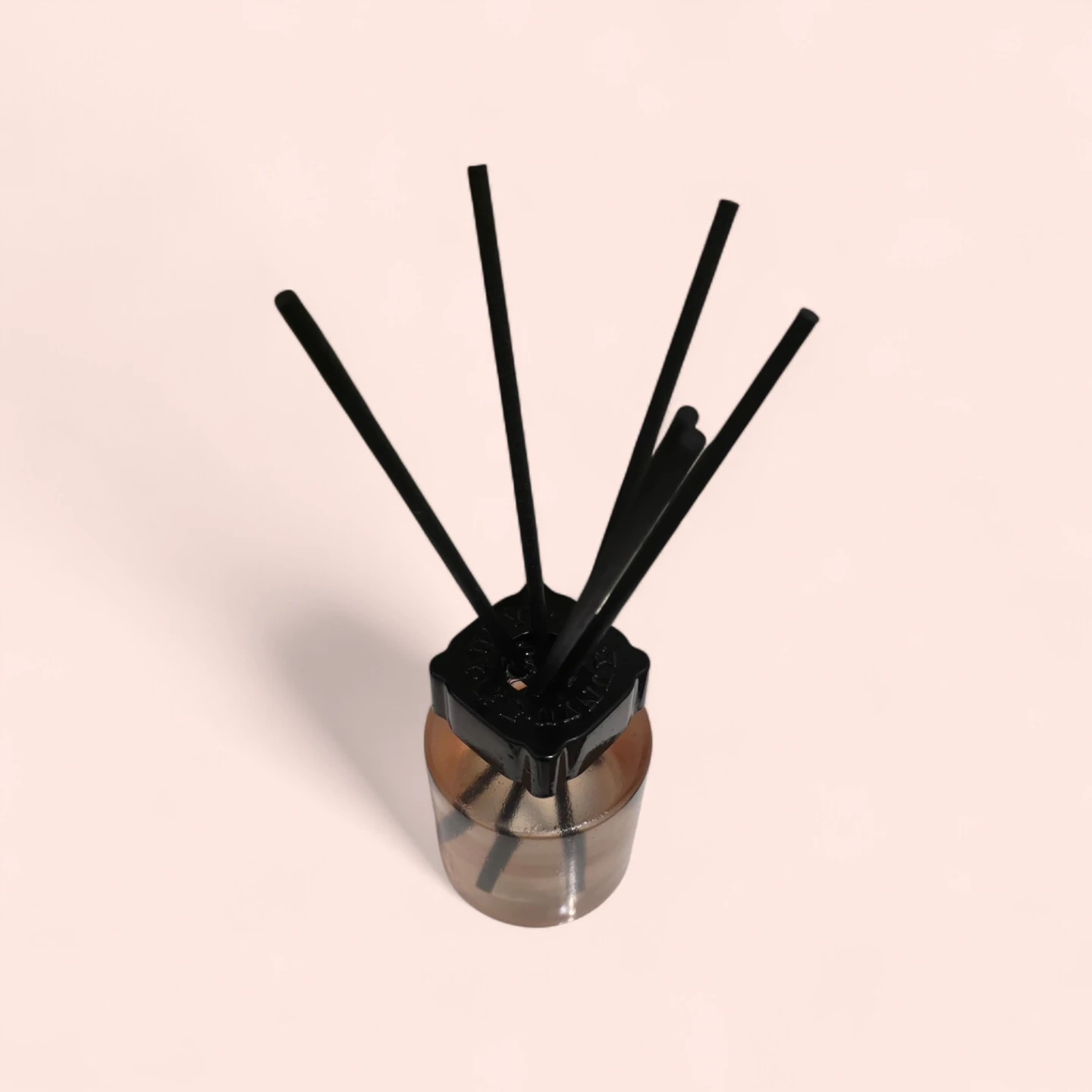 Glass reed diffuser bottle with black reeds. Creates a pleasant aroma for your home. About 15cm tall with reeds.