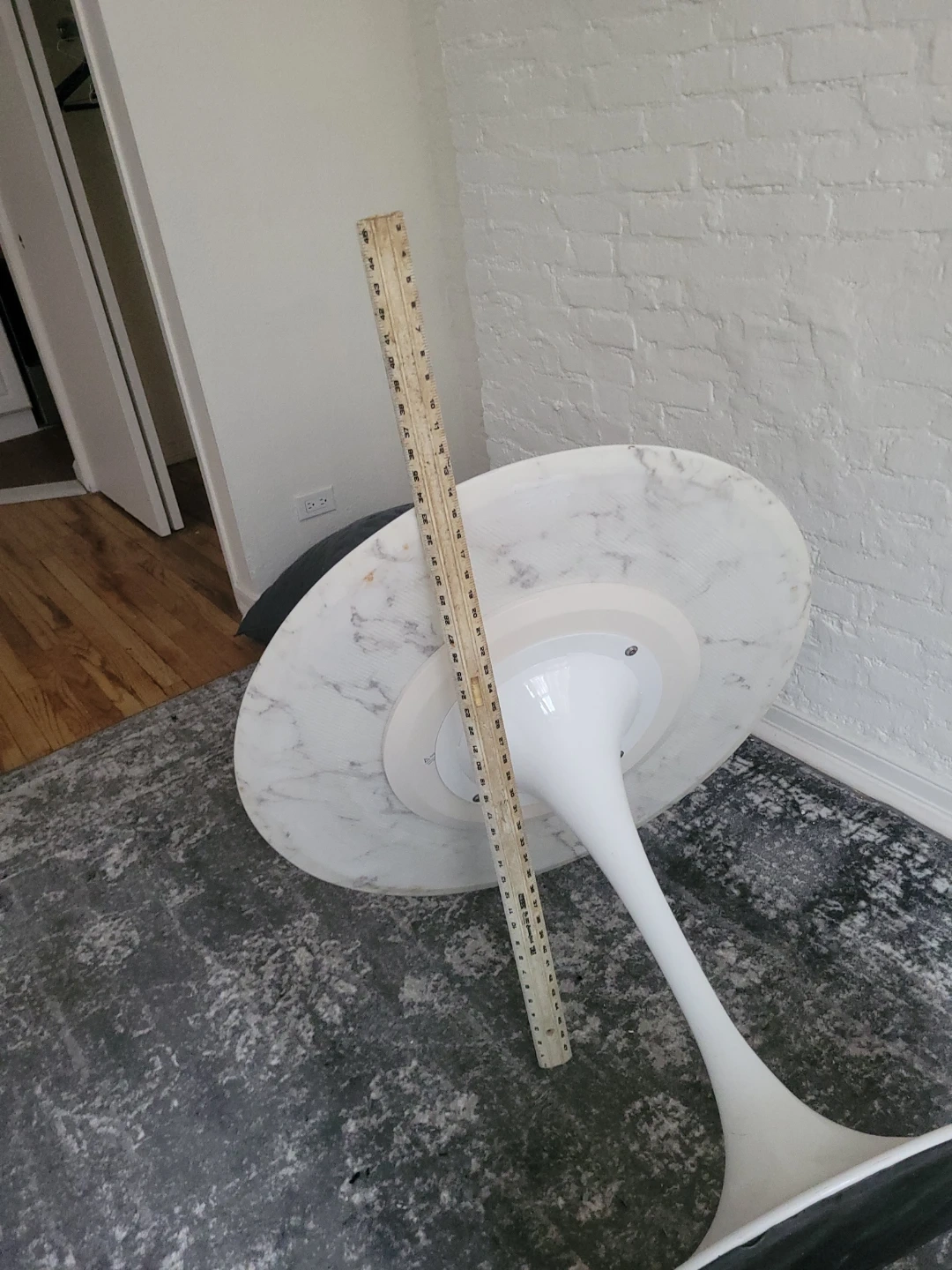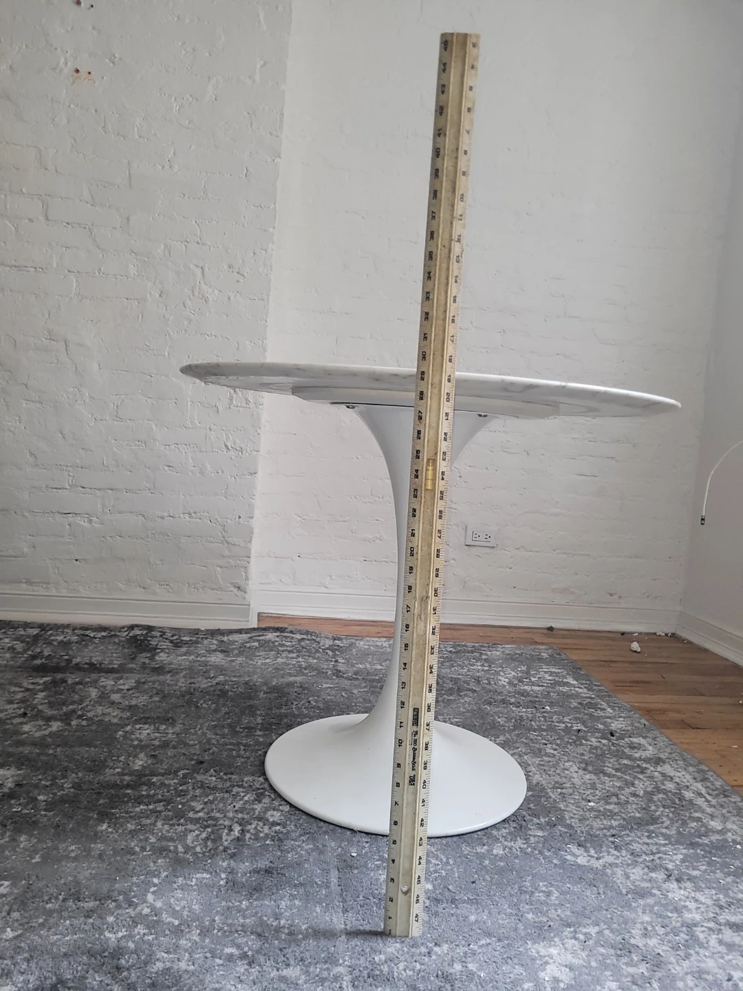 Round marble top table with a white tulip pedestal base. Marble pattern top. White base. It's a nice accent table!