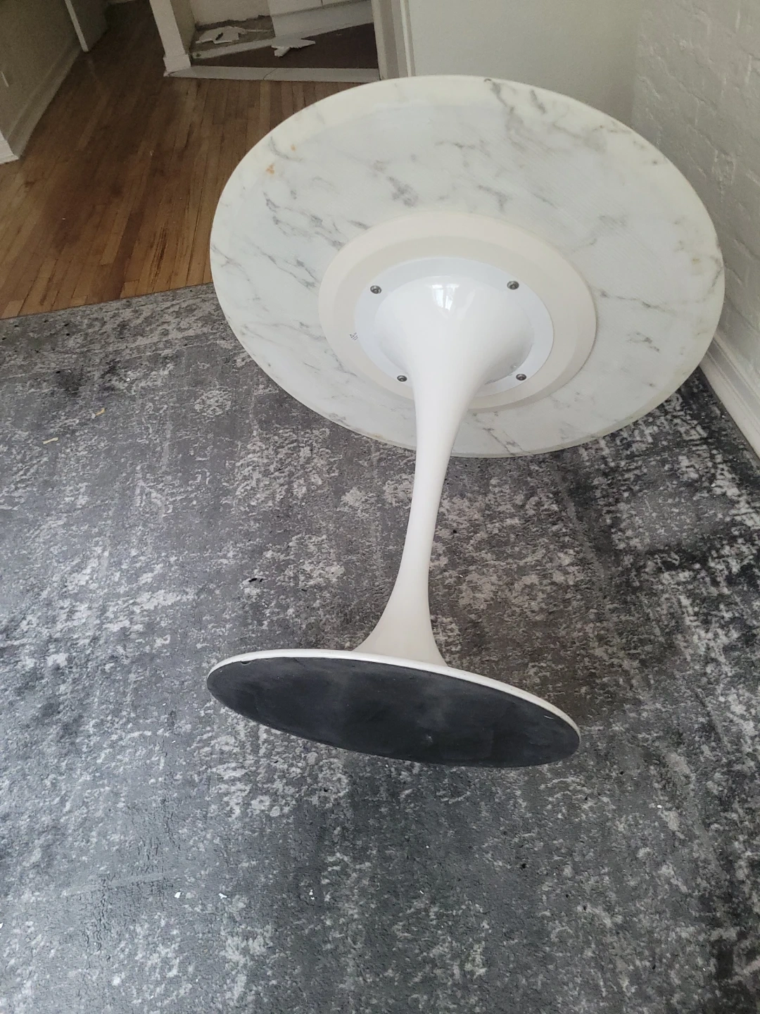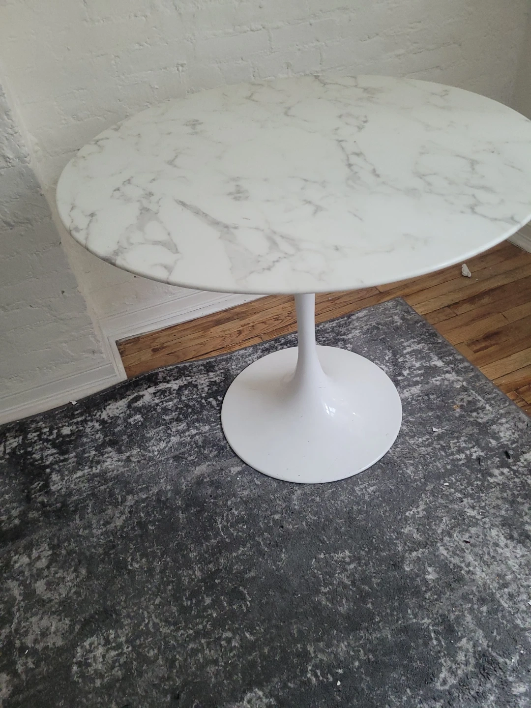 Round marble top table with a white tulip pedestal base. Marble pattern top. White base. It's a nice accent table!