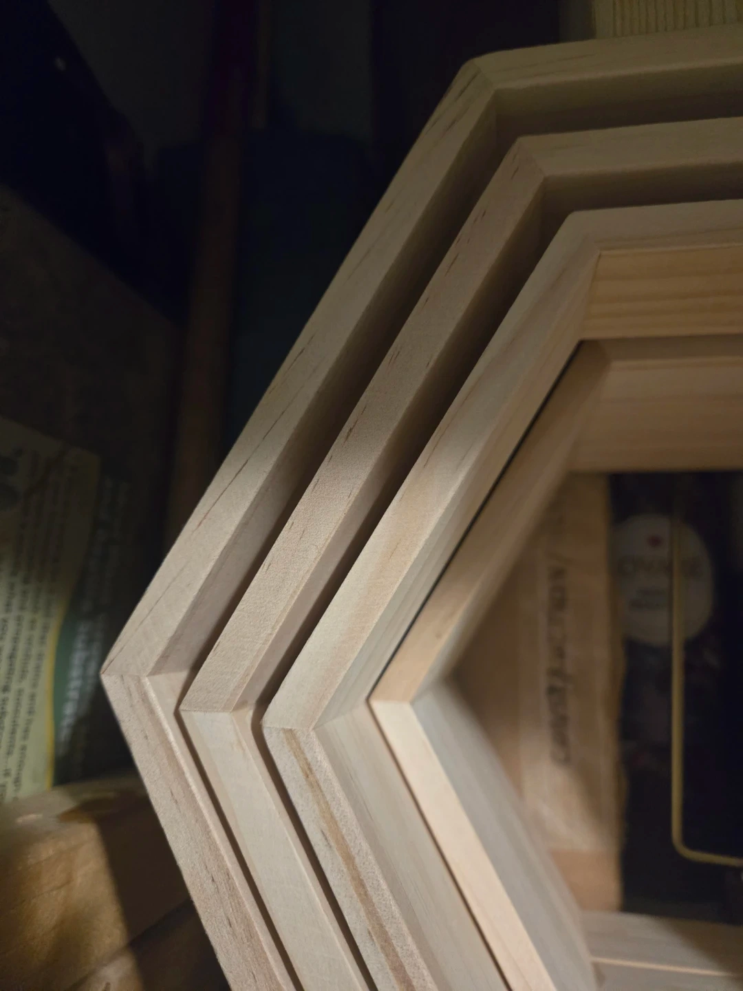 This is a set of four wooden hexagon shelves. They're made of unfinished pine wood and can be stacked together or used separately. These shelves are great for displaying small items or plants!