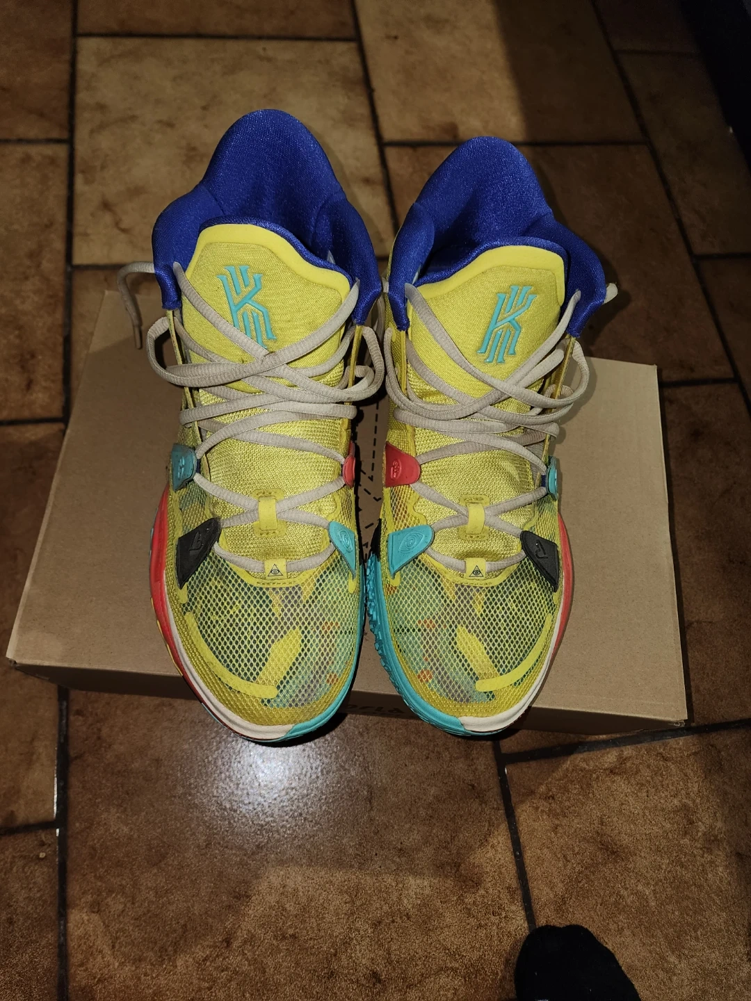 Nike Kyrie 7 basketball shoes in a yellow, blue, and multi-colour design. These feature "1 World 1 People" branding on the heel. Comes with the original box.