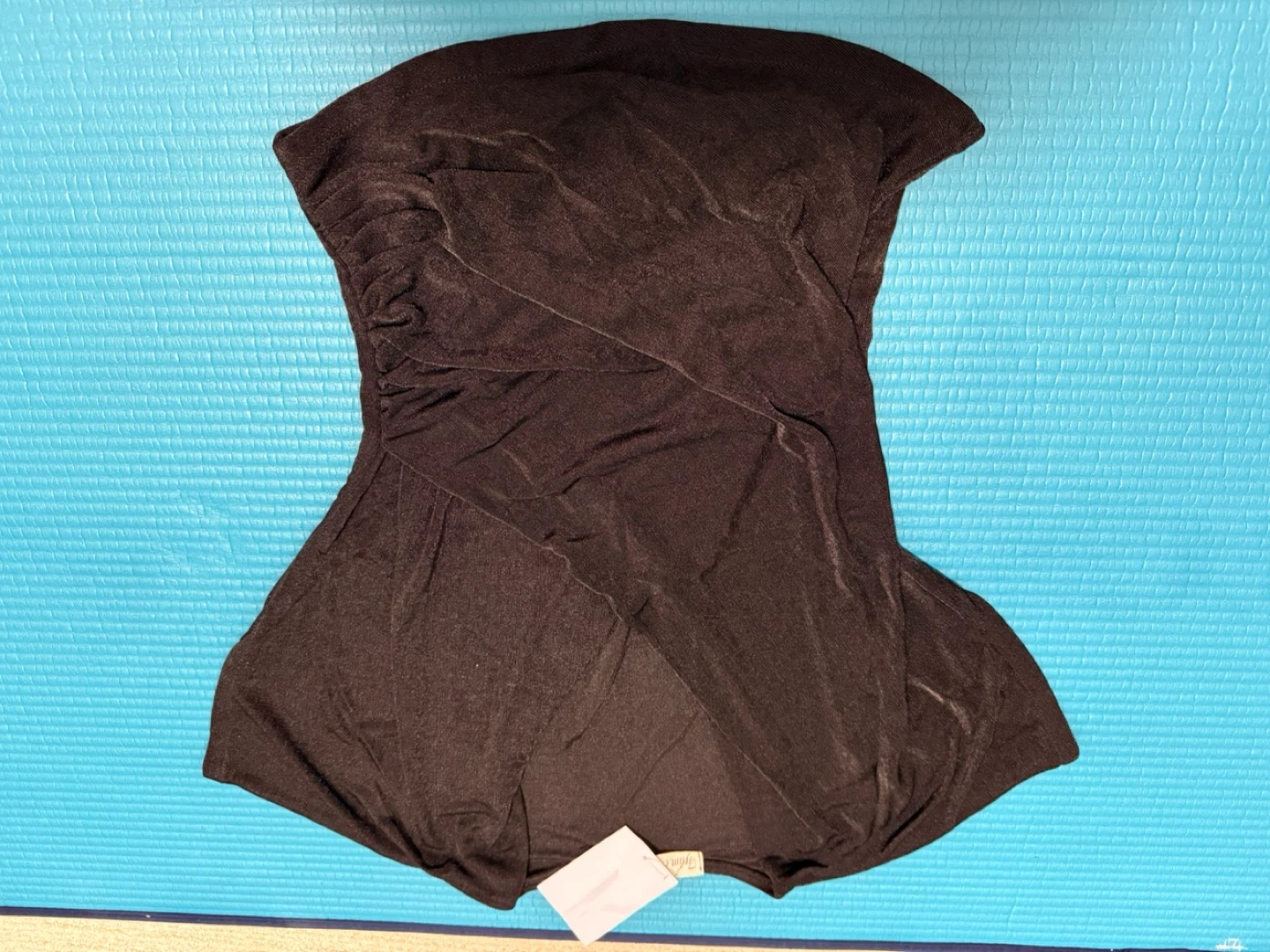 This black strapless top features subtle ruching on the side. It's made from a soft, stretchy fabric. It's a versatile piece that can be dressed up or down. Fit sizes 50-55 kg