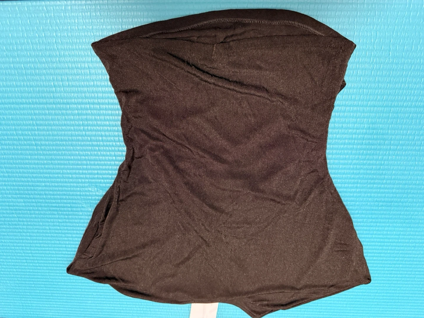 This black strapless top features subtle ruching on the side. It's made from a soft, stretchy fabric. It's a versatile piece that can be dressed up or down. Fit sizes 50-55 kg