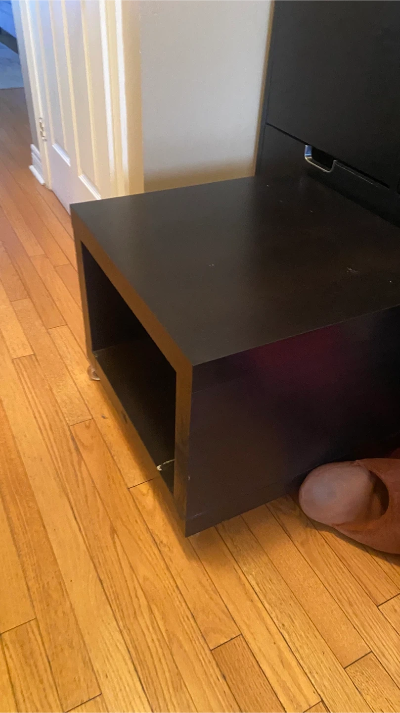 A handy black cube storage side table. It's on wheels for easy moving! Plenty of space inside for storage or display. This table is about 20 inches wide and 20 inches tall.