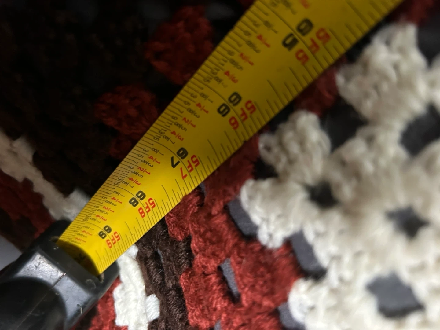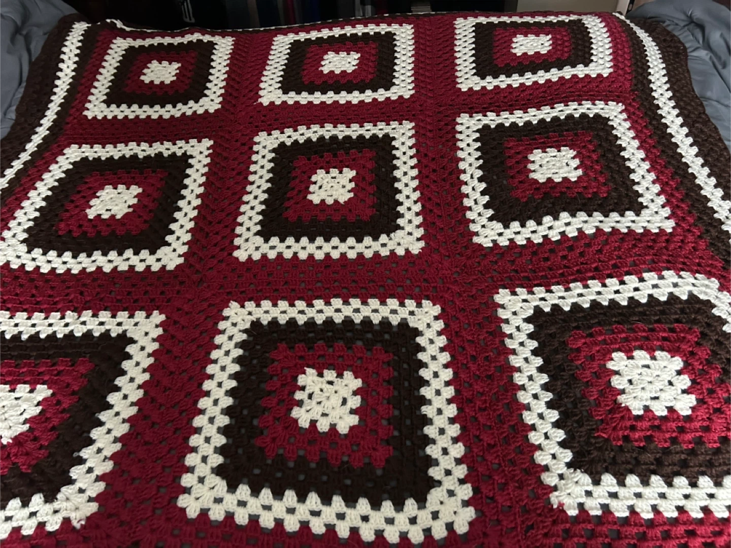 A lovely handmade crochet blankets featuring a classic granny square design. It's made with acrylic yarn in a cozy colour palette of brown, burgundy, and cream. This blanket measures approximately 55 inches by 55 inches, perfect for adding warmth and style to any room.