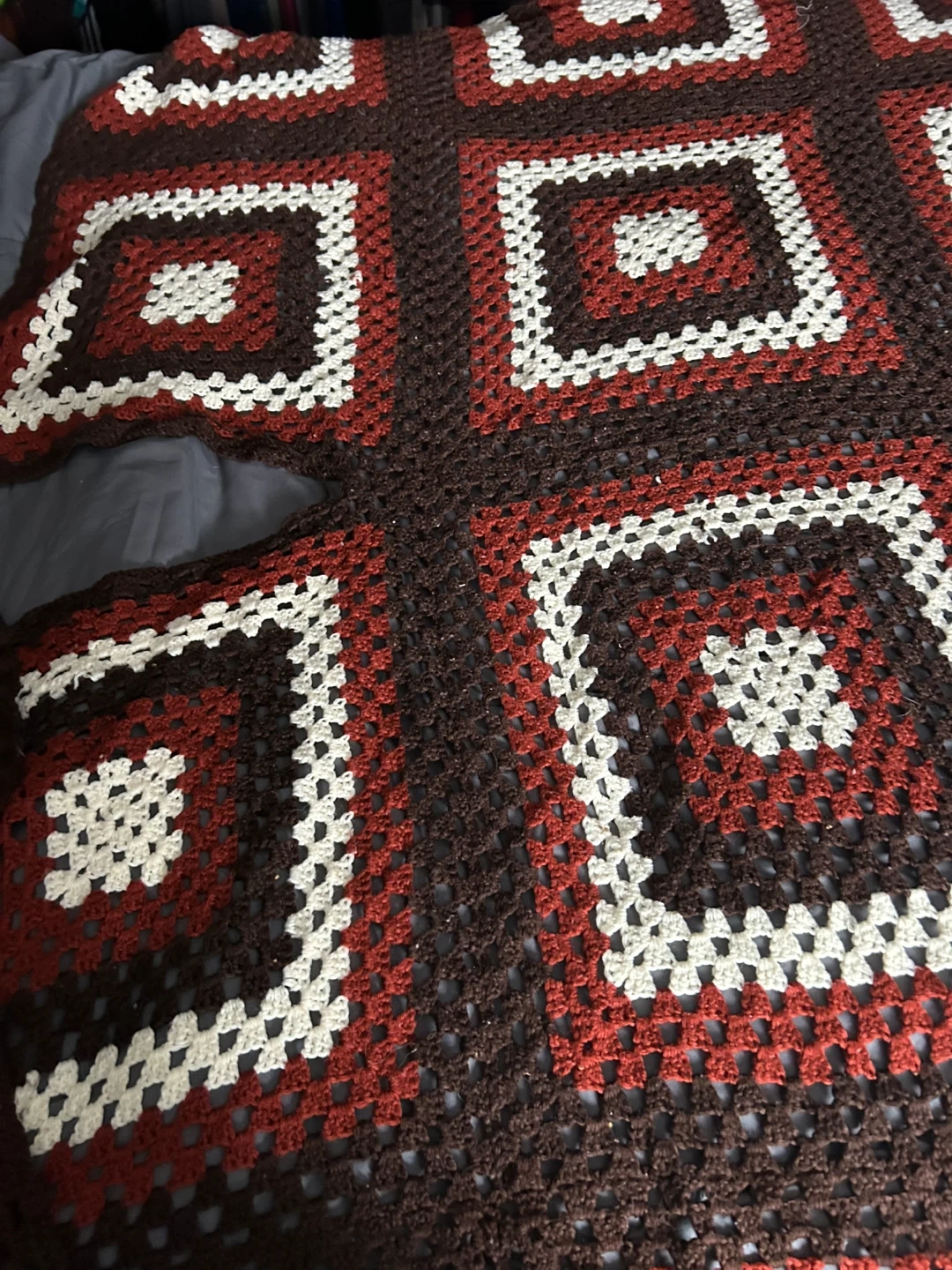 A lovely handmade crochet blankets featuring a classic granny square design. It's made with acrylic yarn in a cozy colour palette of brown, burgundy, and cream. This blanket measures approximately 55 inches by 55 inches, perfect for adding warmth and style to any room.