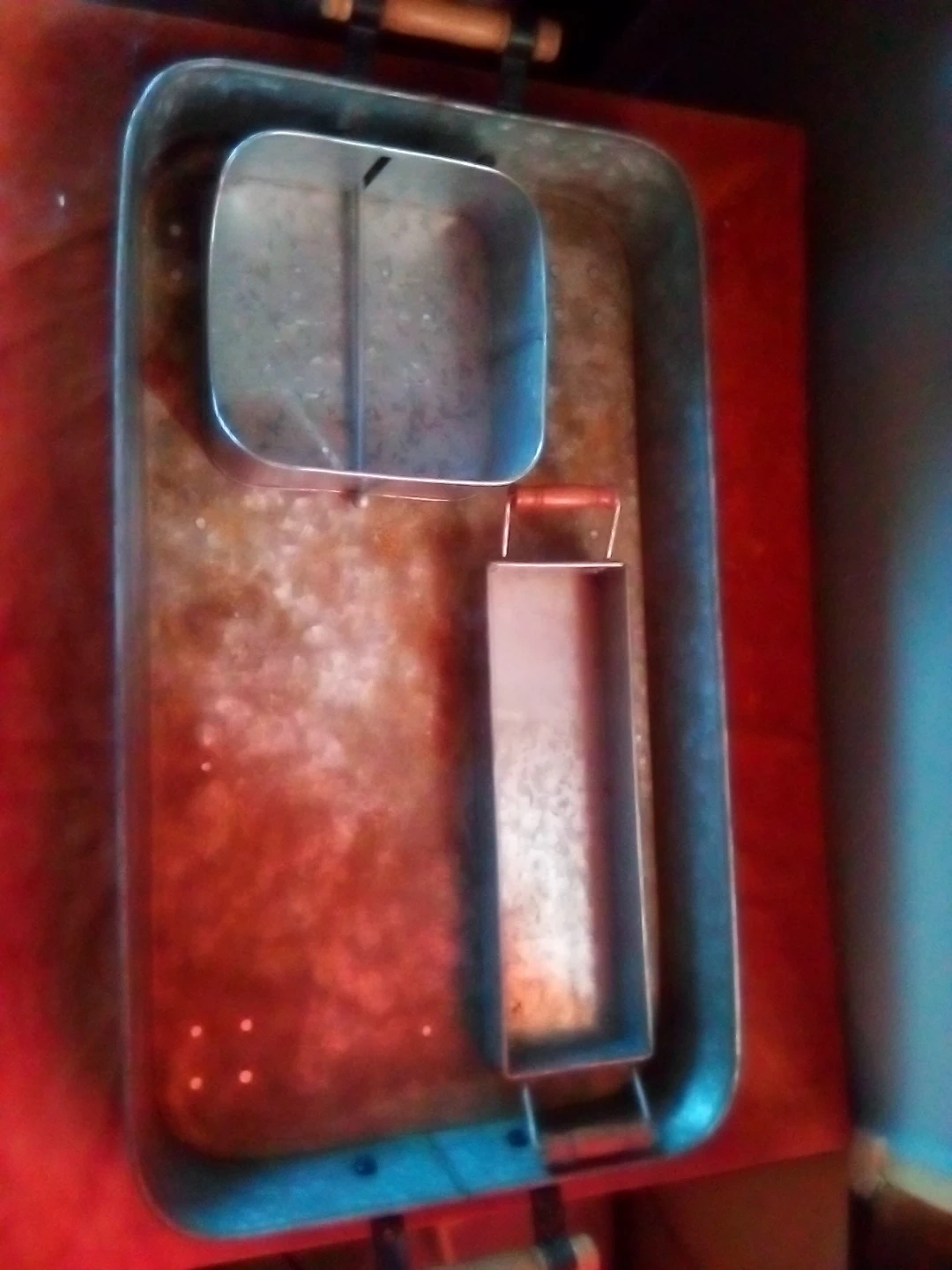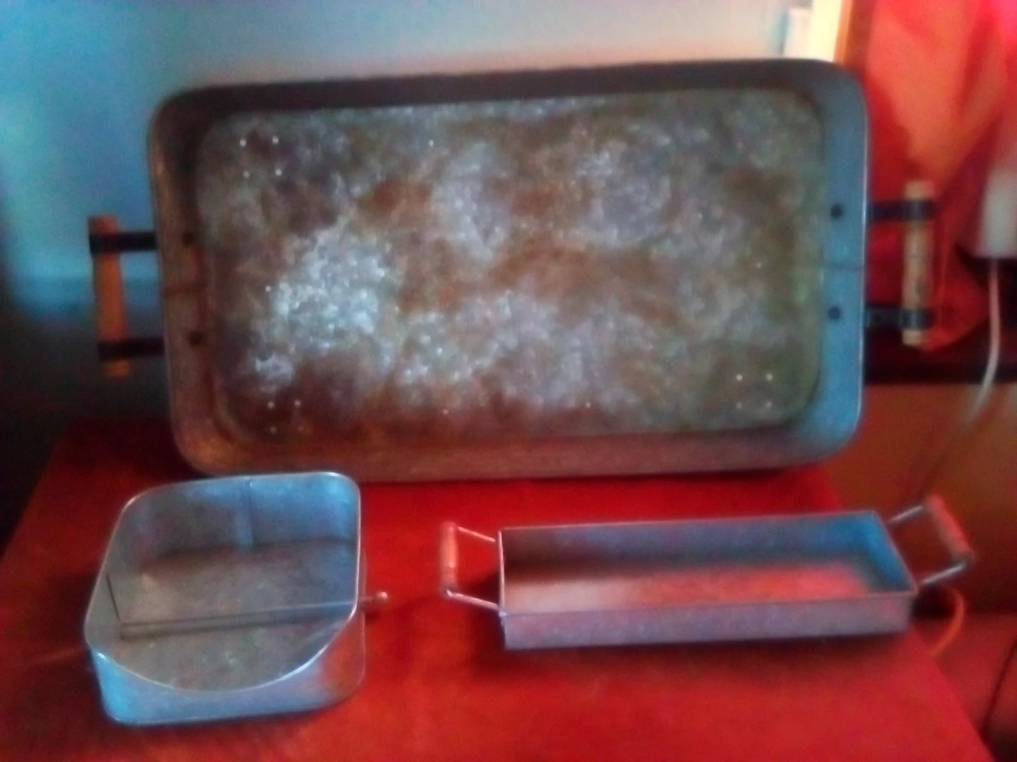 Selling a set of three galvanized metal serving trays. They have a rustic look and could be used for serving or decor. There is a large tray, a square tray, and a long rectangular tray.