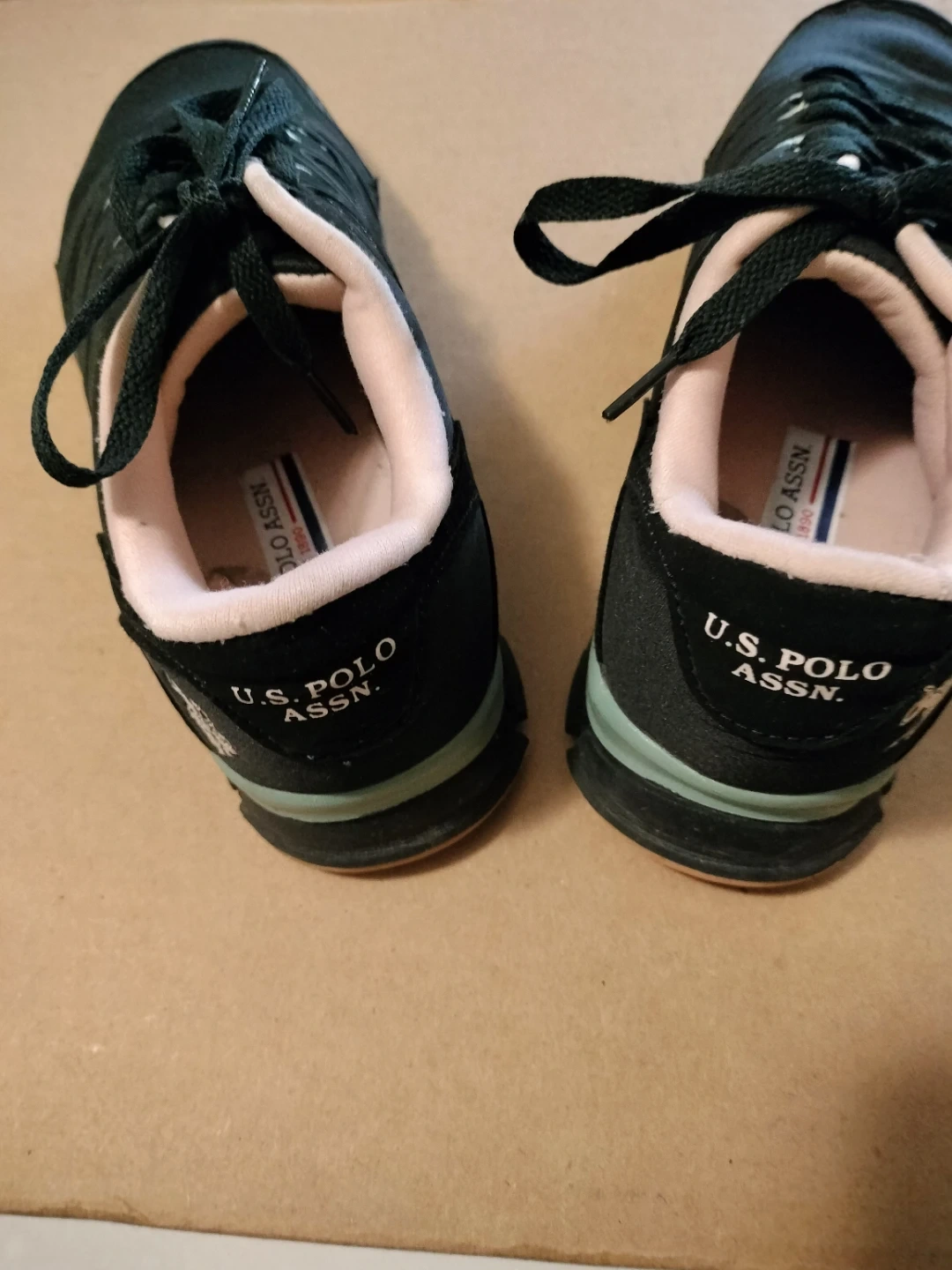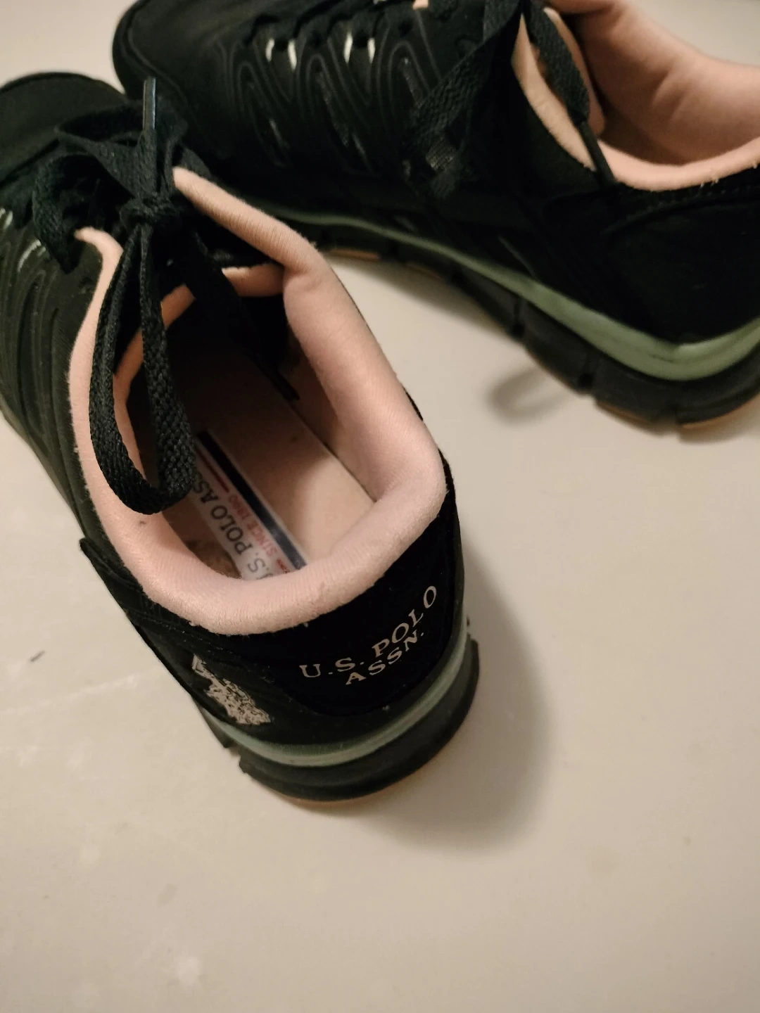 These U.S. Polo Assn. sneakers are black with pink accents. They feature lace-up closures and a cushioned sole. Great for everyday wear!