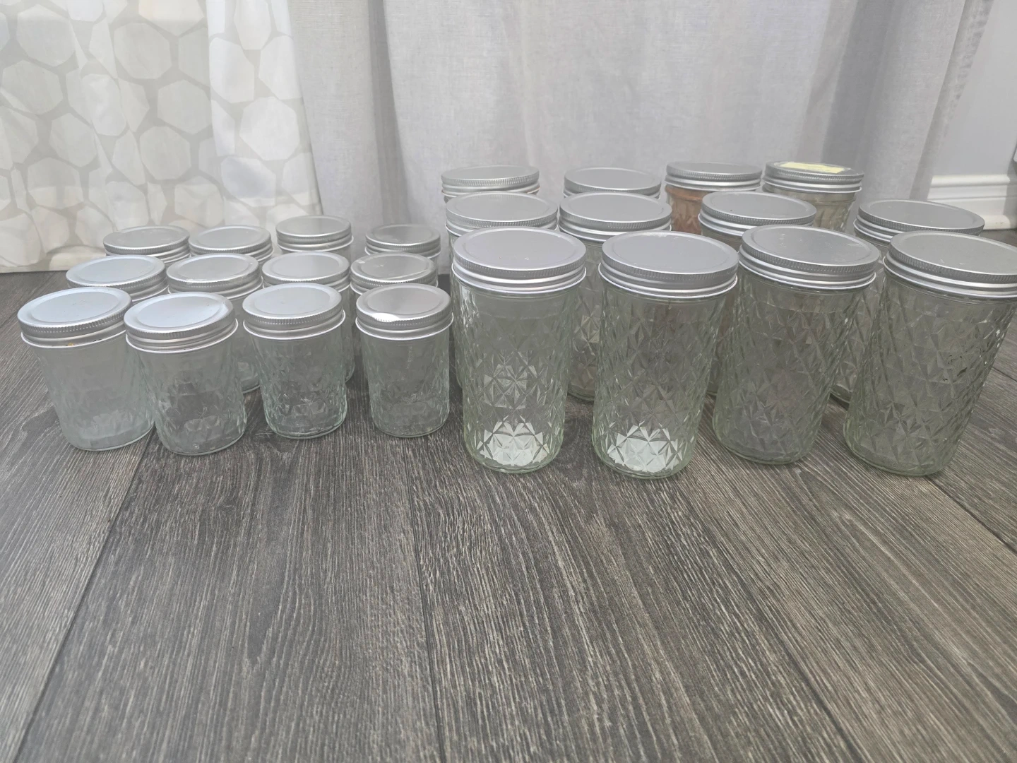 This set includes twenty-four clear glass mason jars with diamond-patterned exteriors and silver metal lids. They're great for canning, preserving, or storage. A versatile set for your kitchen needs! 12 small and 12 big