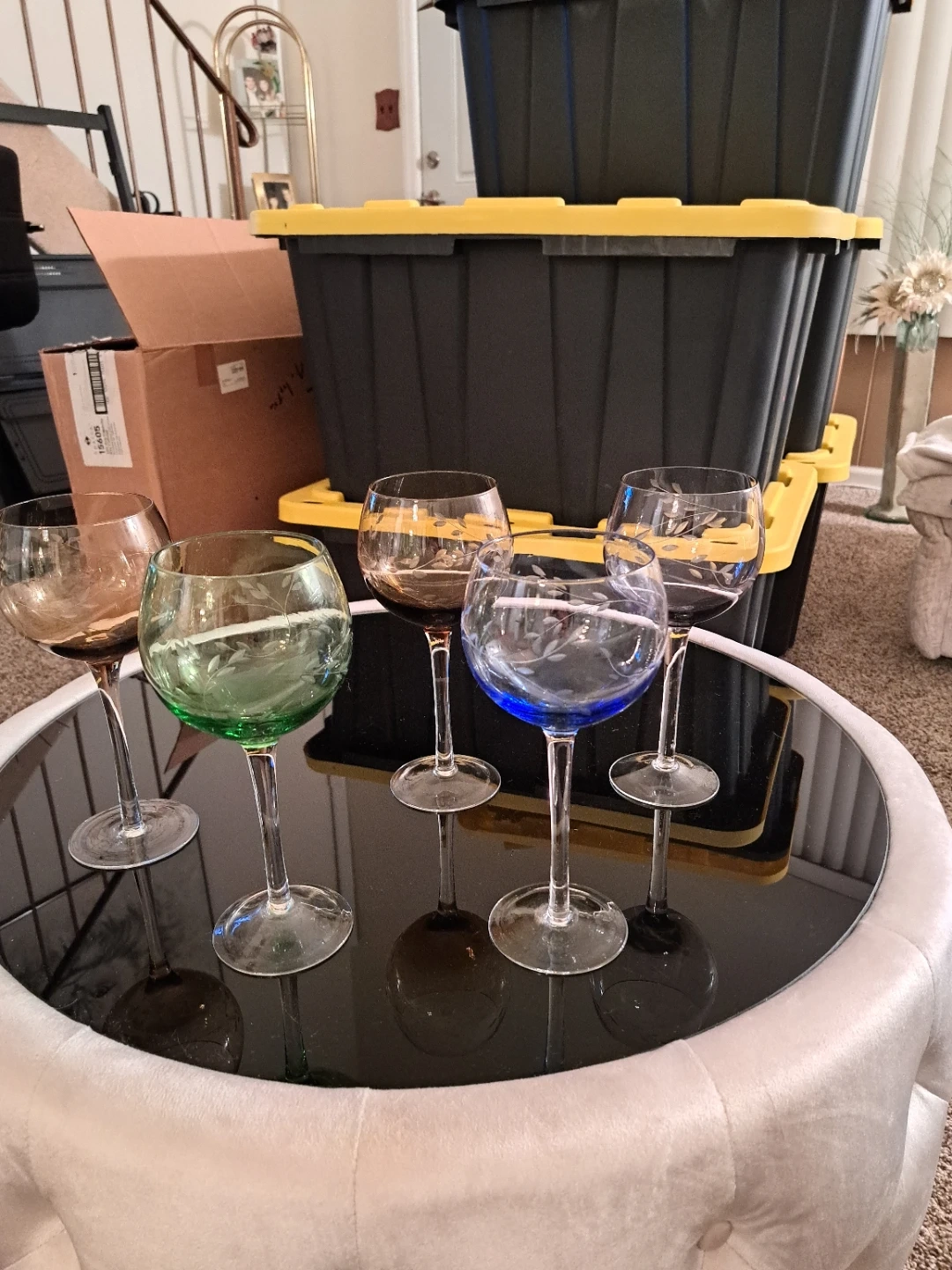 This set includes five stemmed wine glasses, each with a unique etched floral pattern. Colors include amber, green, blue, and clear. They're perfect for serving wine or other beverages at gatherings!