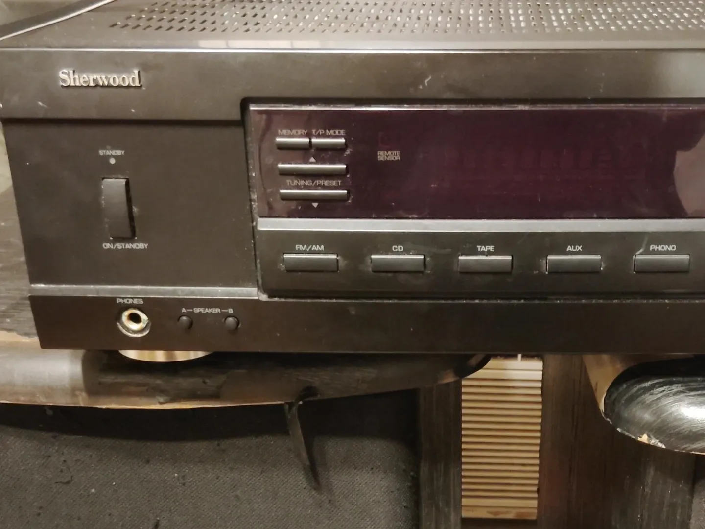 This is a Sherwood receiver with multiple input options including FM/AM, CD, Tape, Aux, and Phono. It also features a headphone jack and speaker A/B outputs. The unit has a standby mode and controls for tuning and memory presets.