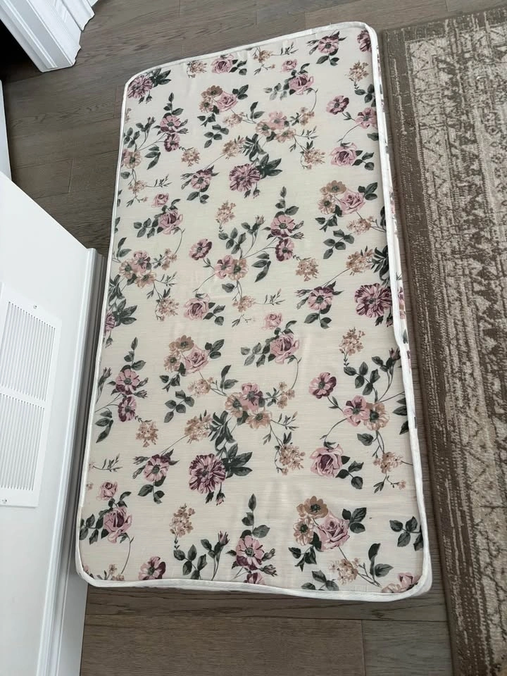 A white standard baby crib. Comes with two mattresses. Missing some screws, use at your own risk. We used it as is and had no problems. Feel free to message if you have any questions!