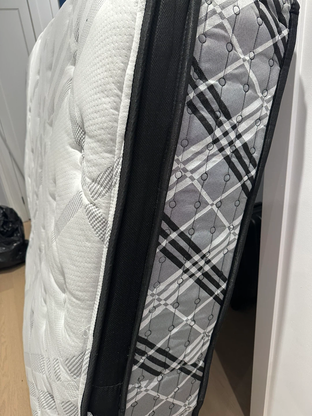 This is a queen-size mattress with a white and grey checkered design. It features a quilted top with a stitched pattern. The sides have a black border.