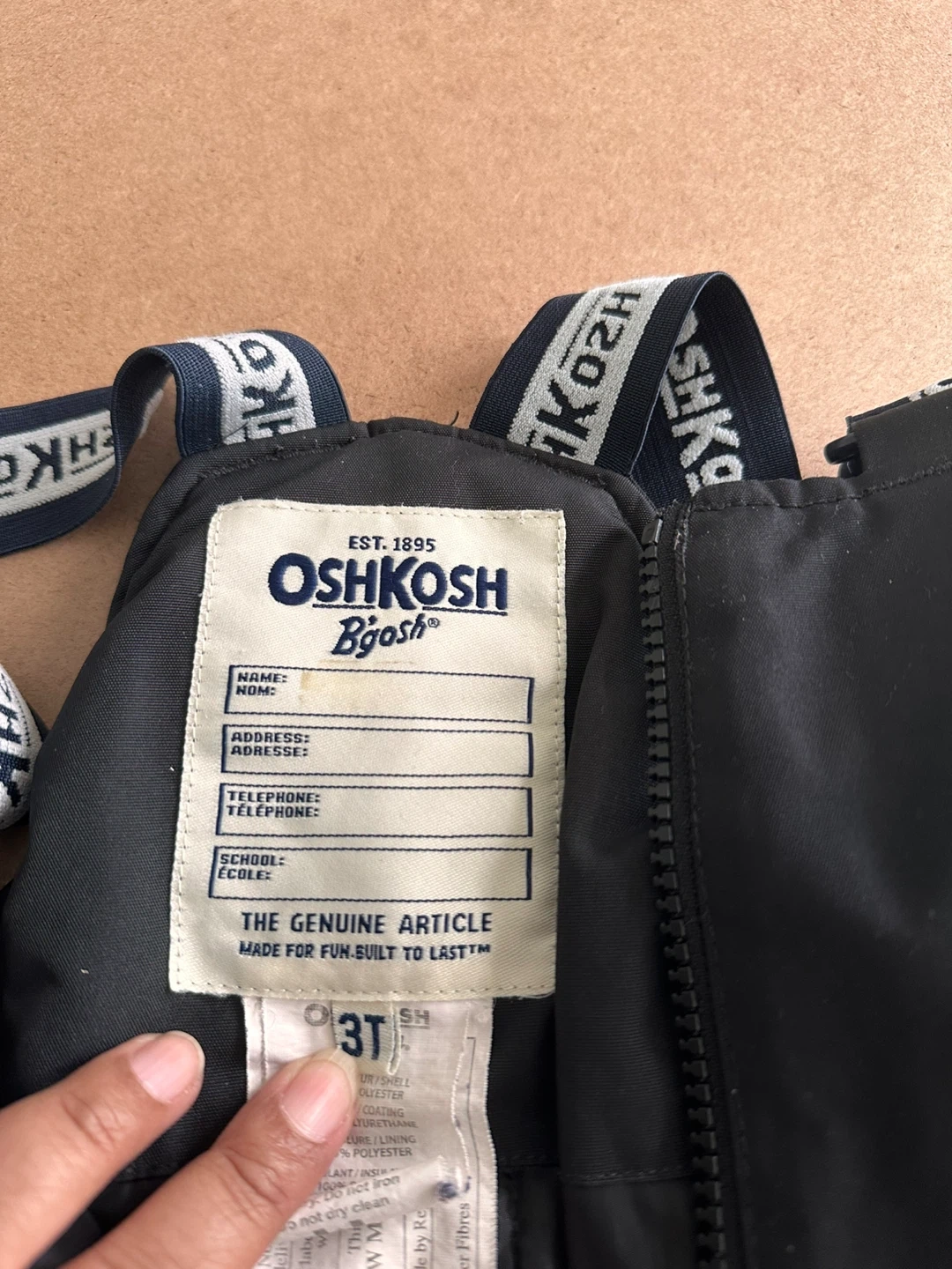 Keep your little one warm with these OshKosh B'gosh black snow pants! They're in great condition and ready for some winter fun. The size is 3T, perfect for toddlers. They feature adjustable OshKosh branded straps and a front zipper for easy wear.
