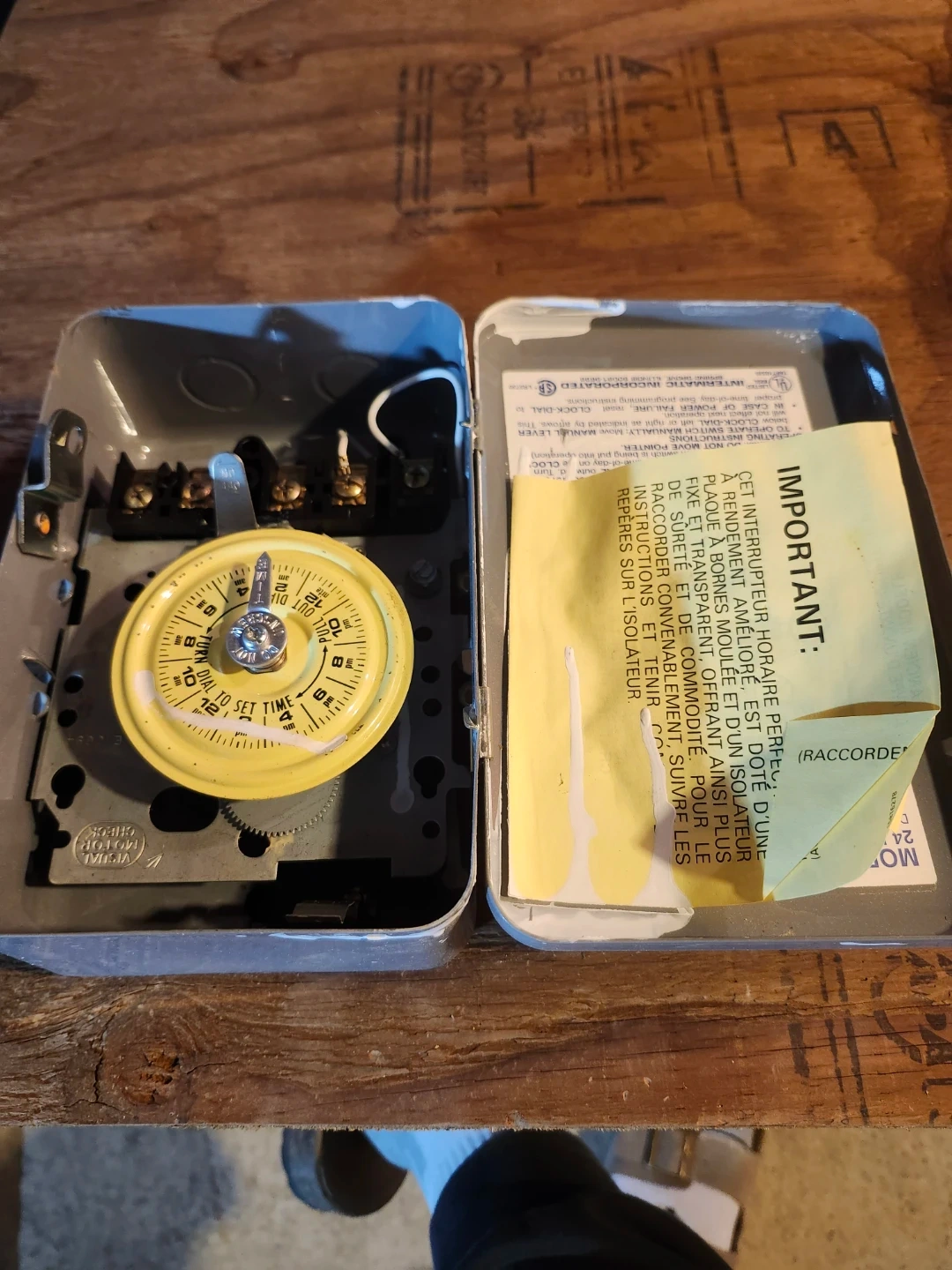 This is an Intermatic mechanical time switch with a yellow dial for setting time. It's designed for convenience and safety. The unit includes internal wiring and a manual lever for operation.