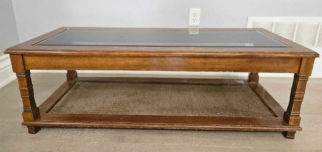 Vintage Wood Coffee Table w/ Glass Top & Woven Shelf