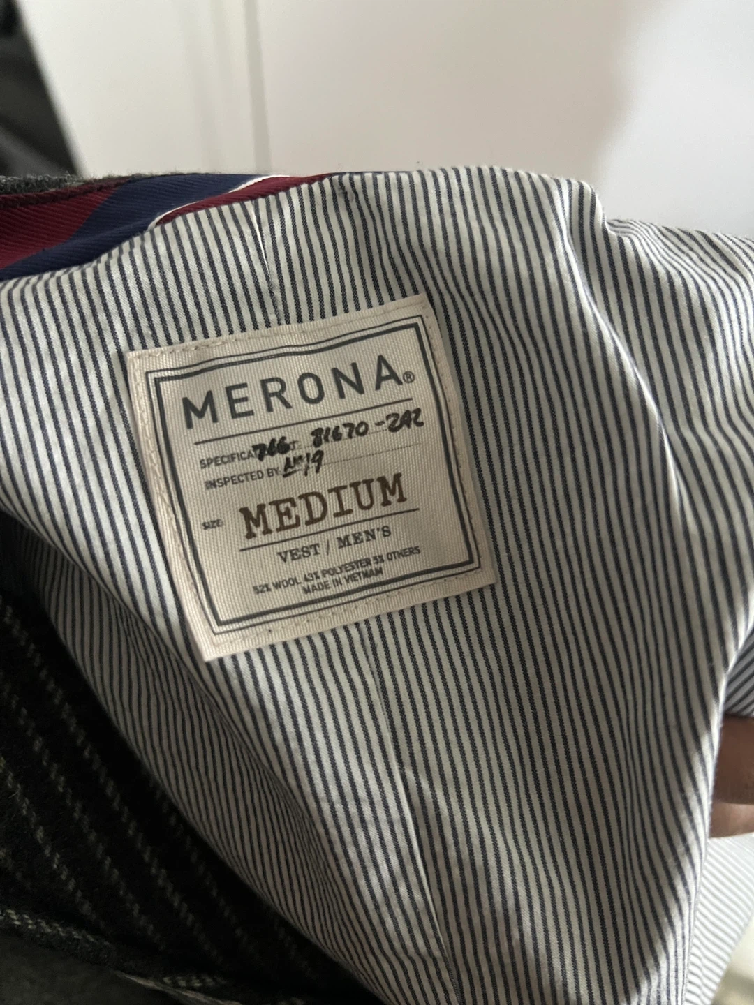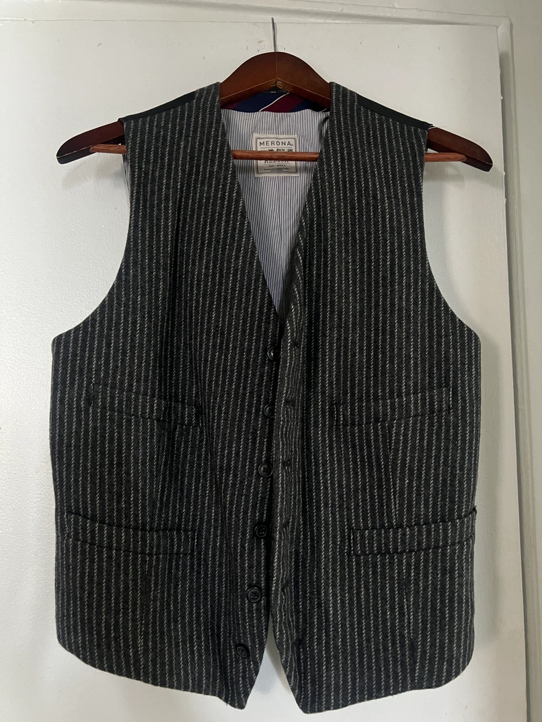 Buy & SellMerona Men's Pinstripe Vest - MediumMerona Men's Pinstripe Vest - Medium$10This is a Merona men's pinstripe vest in medium size. It's made of 52% wool, 43% polyester, and 5% others. The lining is striped.BrandMeronaWHERE TO MEETKeele/WilsonView MapSELLERverifiedAnnDownsview600 reviews1 chats·0 favorites·5 viewsSEND CHAT TO SELLERHi Ann! I’m interested in your listing.Hi Ann! I’m interested in your listing.Get the Karrot app to chatSign In to chat