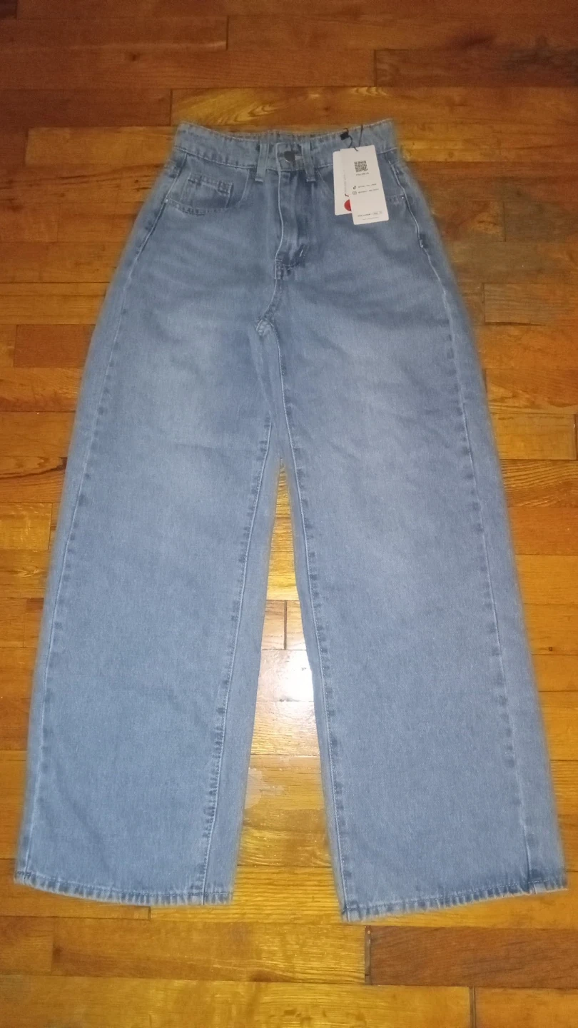 These light wash denim jeans have a wide leg silhouette. They're made of cotton and feature a classic five-pocket design. These pants are perfect for casual wear!