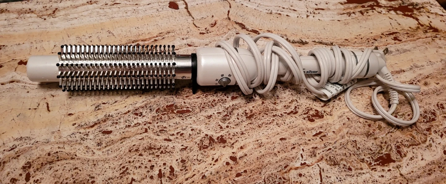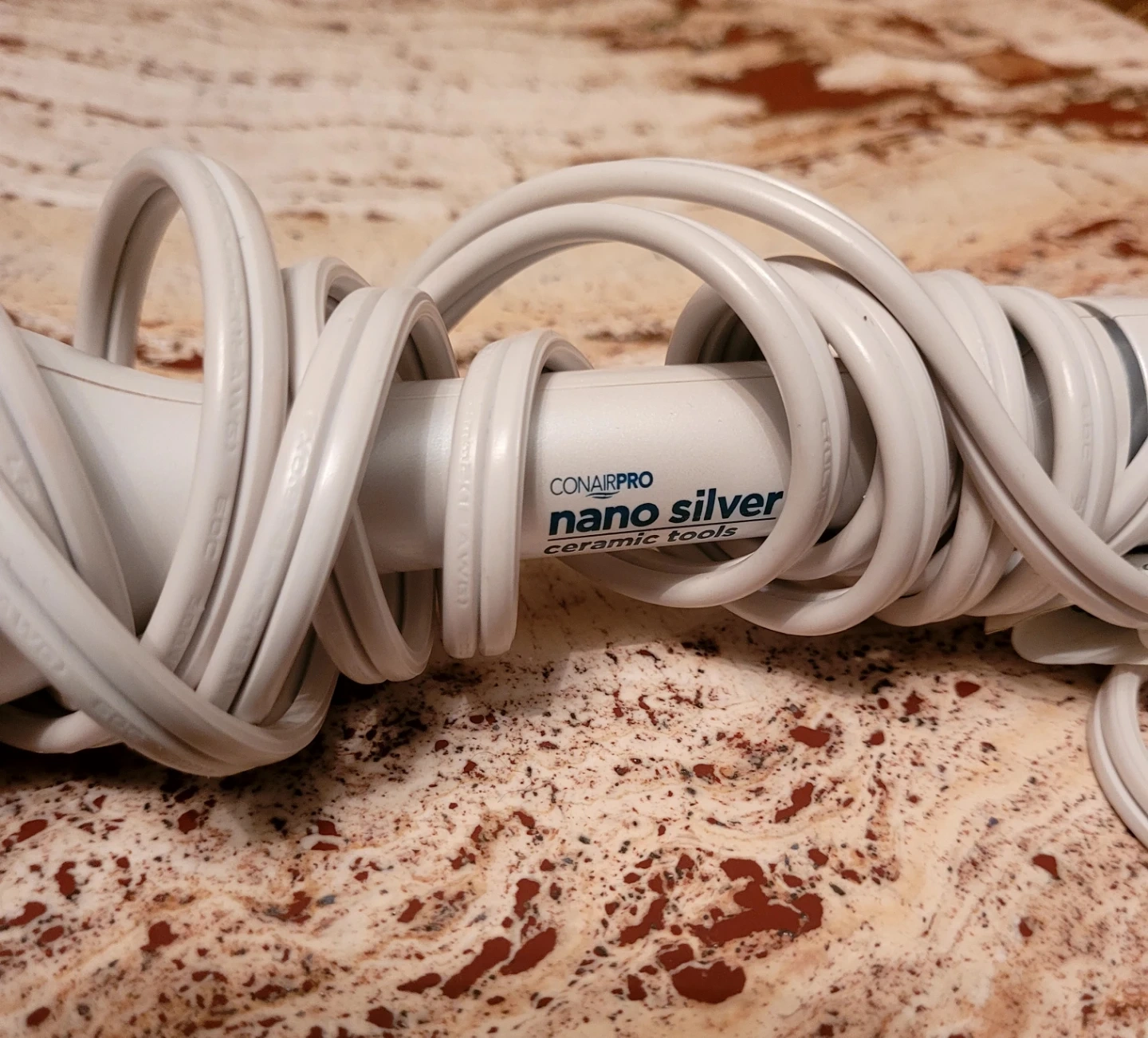 This ConairPro Nano Silver ceramic tools rotating hot air brush is white. It's a handy styling tool for your hair. It has a rotating barrel for easy styling.