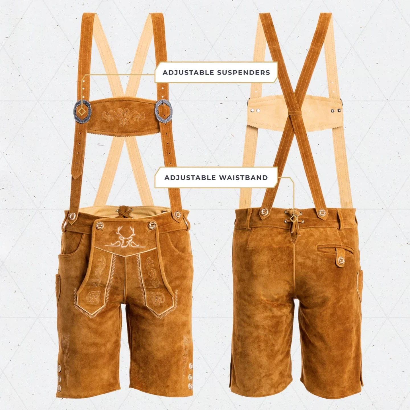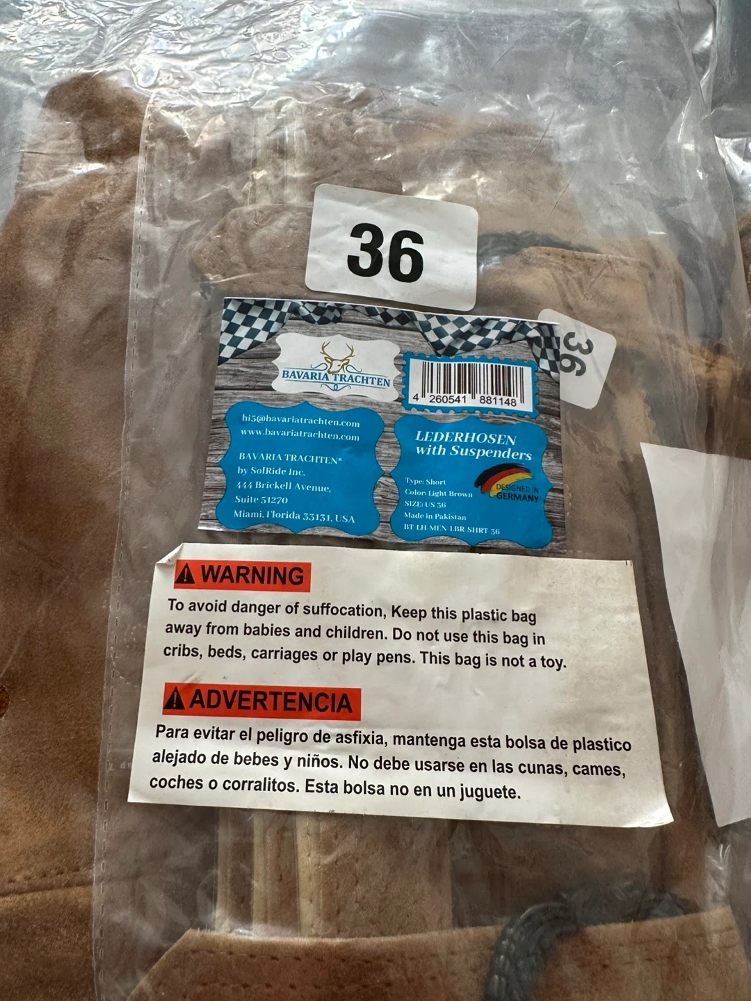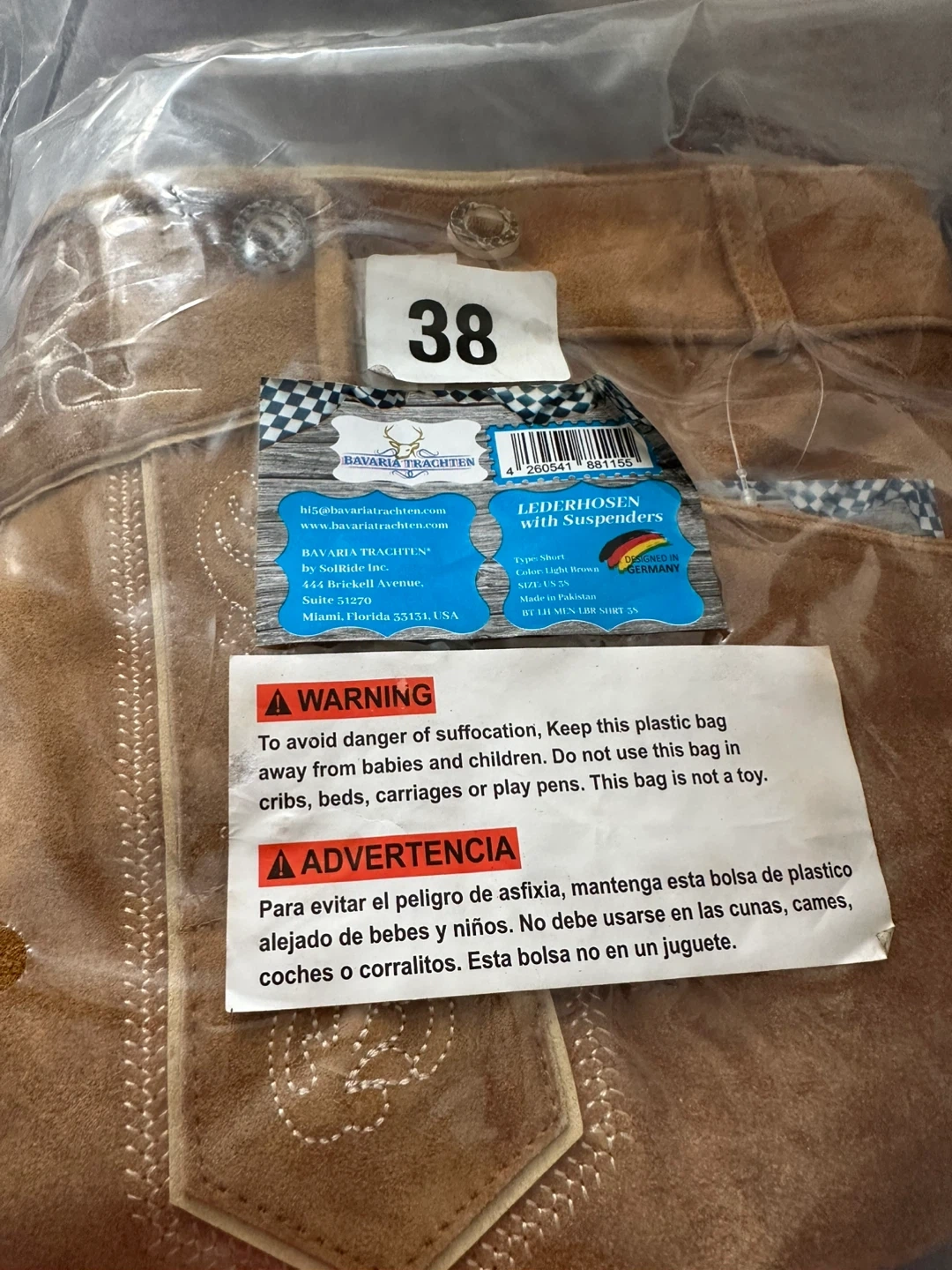 Selling two pairs of Bavaria Trachten Lederhosen with Suspenders. These are size 38 and 36 in a light brown color. They are made in Pakistan and designed in Germany. These lederhosen are short and come with adjustable suspenders and waistband