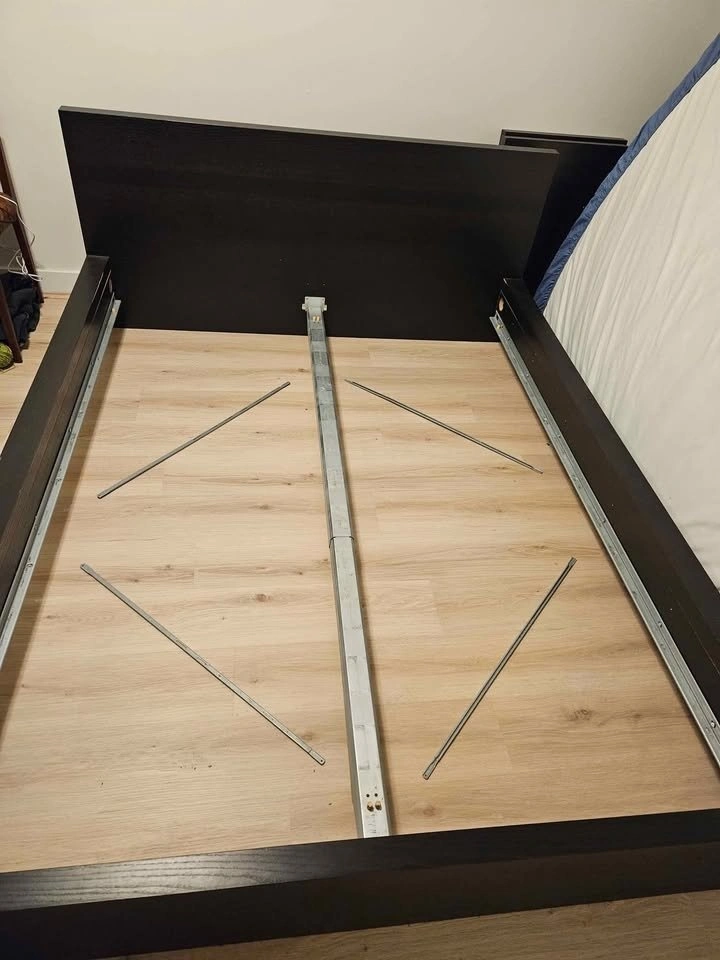 Dark brown Ikea Malm bed frame - queen size. Comes with two attached bedside tables (tables no longer available at Ikea) and slats.