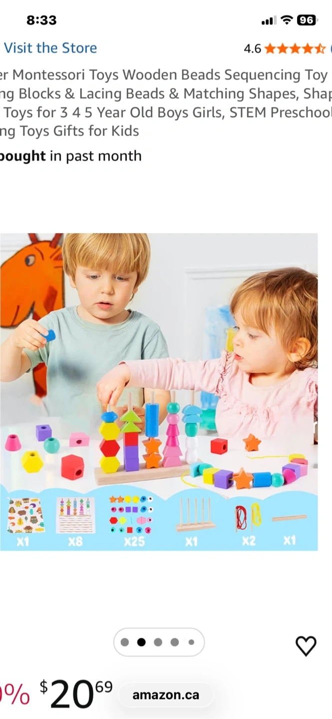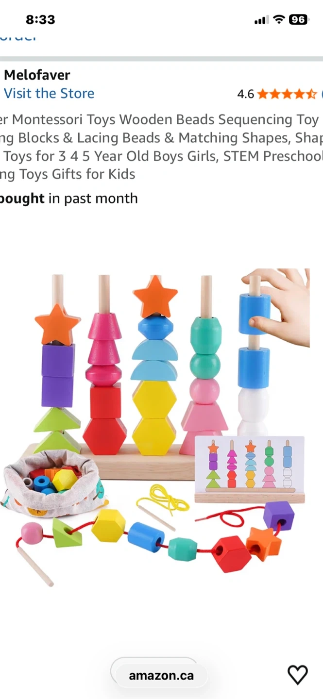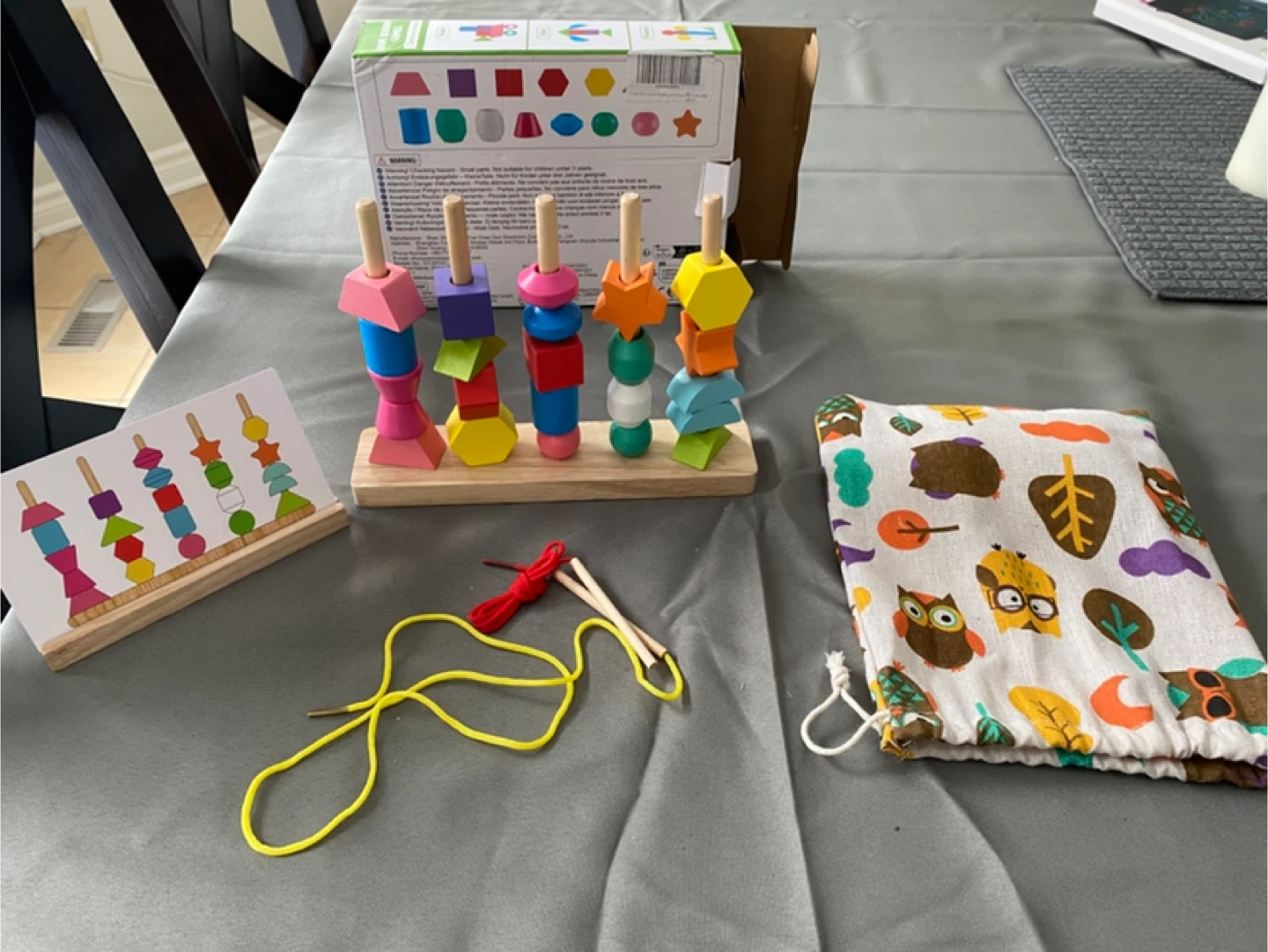 A Montessori wooden beads sequencing and lacing toy. It includes various colourful shapes, lacing cords, and pattern cards. This toy is great for developing fine motor skills and hand-eye coordination in young children. New never used.