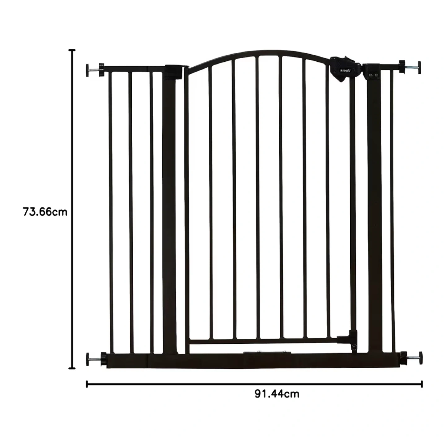 This metal gate is 37 inches tall and adjusts to fit openings between 29 and 30 inches wide. It's made of durable metal with a bronze finish. Includes extra hardware for installation.
