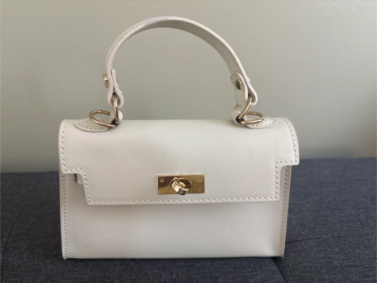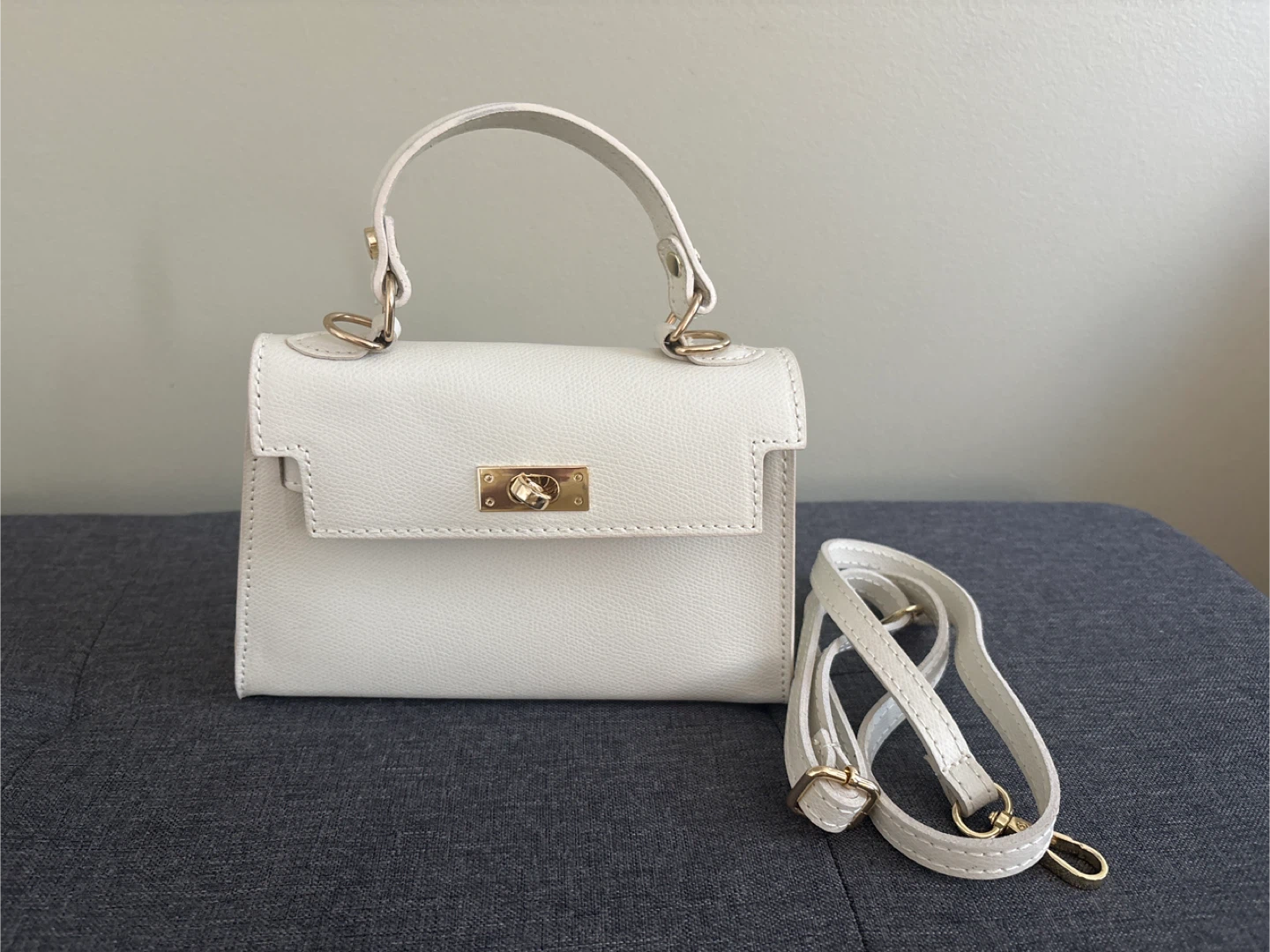 This white handbag is crafted from genuine leather, proudly made in Italy. It features a secure clasp closure and comes with a detachable shoulder strap for versatile wear. A lovely addition for any occasion! Purchased in Italy.
