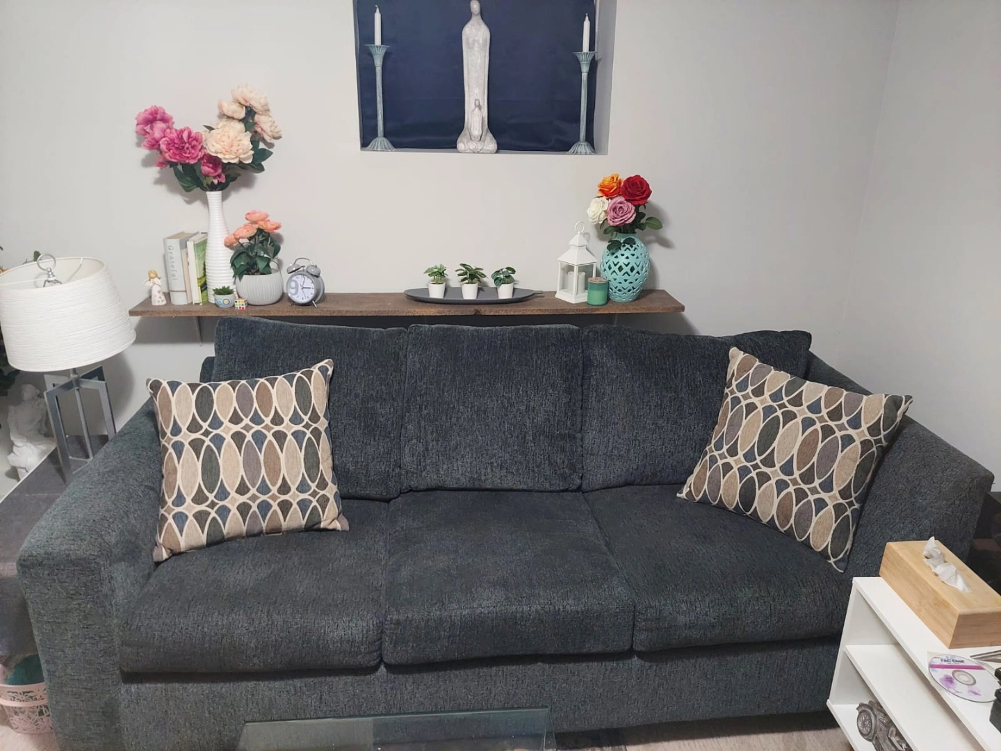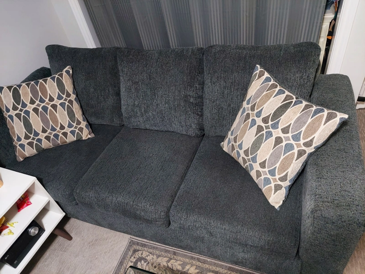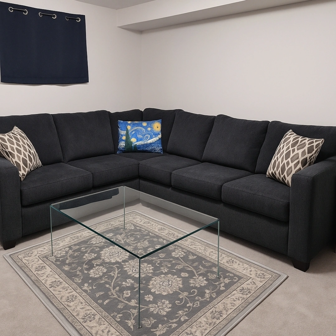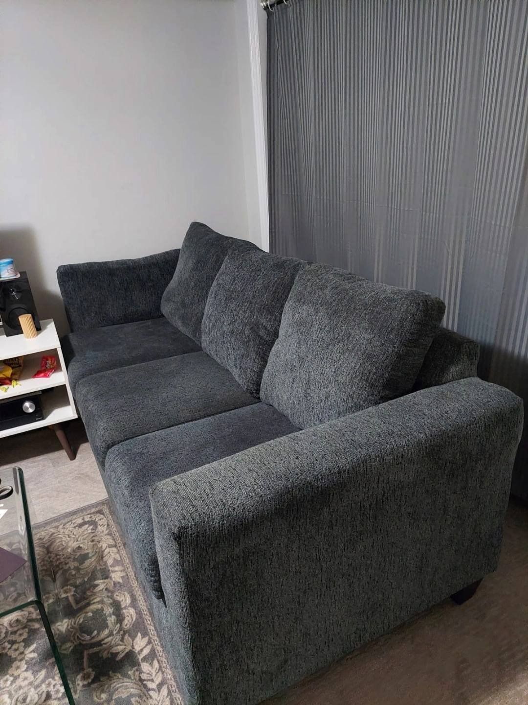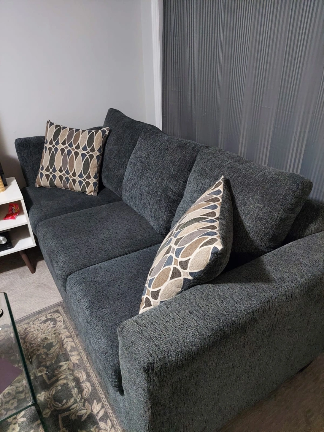 The brick dark charcoal sectional L-shaped sofa with glass coffee table