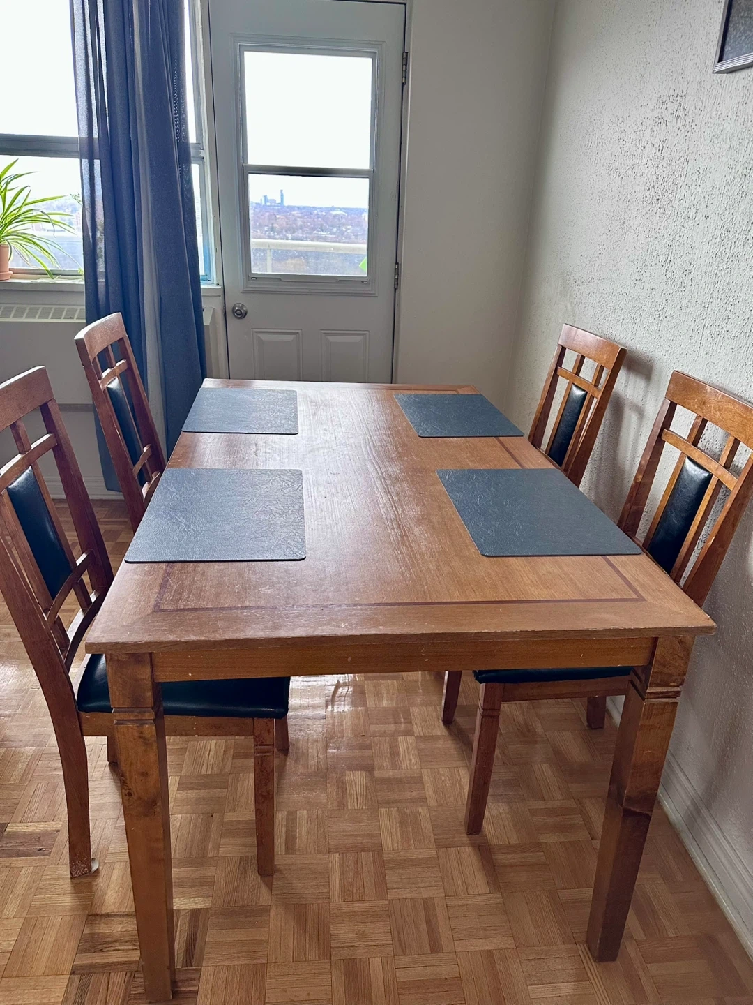 A sturdy wooden dining table with four matching chairs. Each chair has a black vinyl seat. Includes four dark grey placemats. This set is great for smaller dining areas.