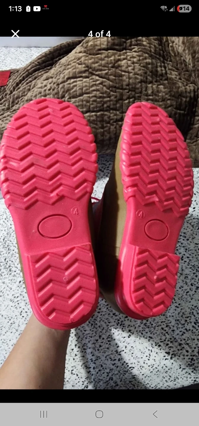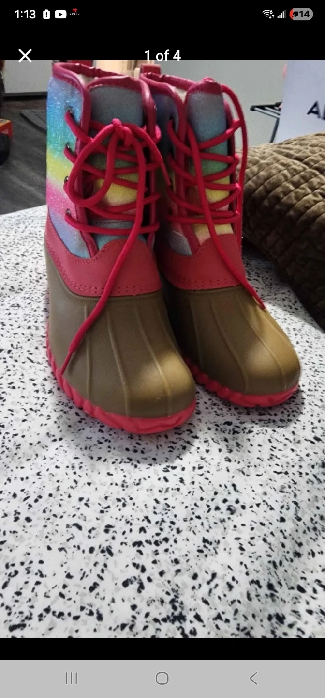 Cute pair of duck boots in a size 4. They feature a rainbow glitter upper and pink soles and laces. Perfect for puddle jumping!