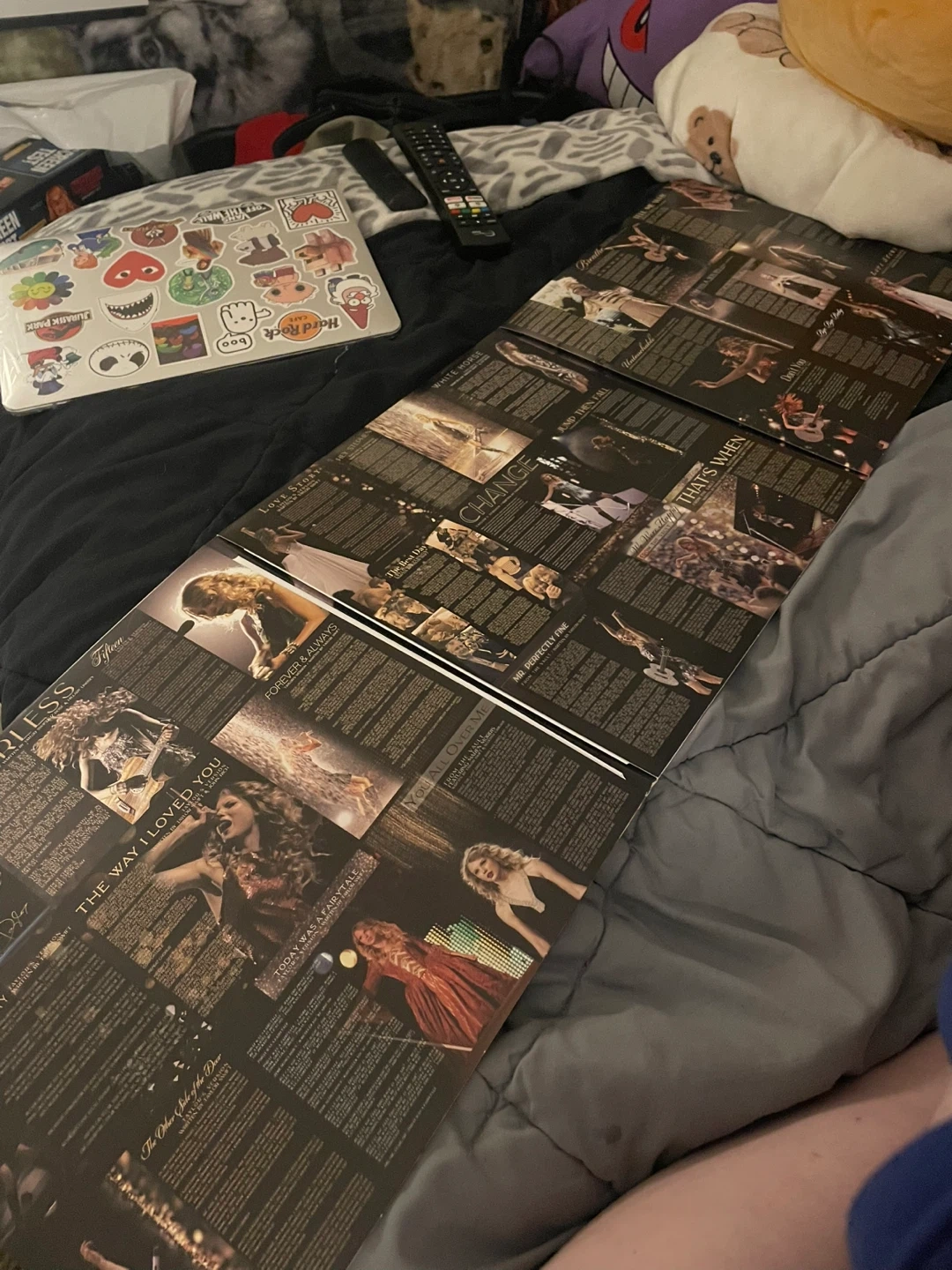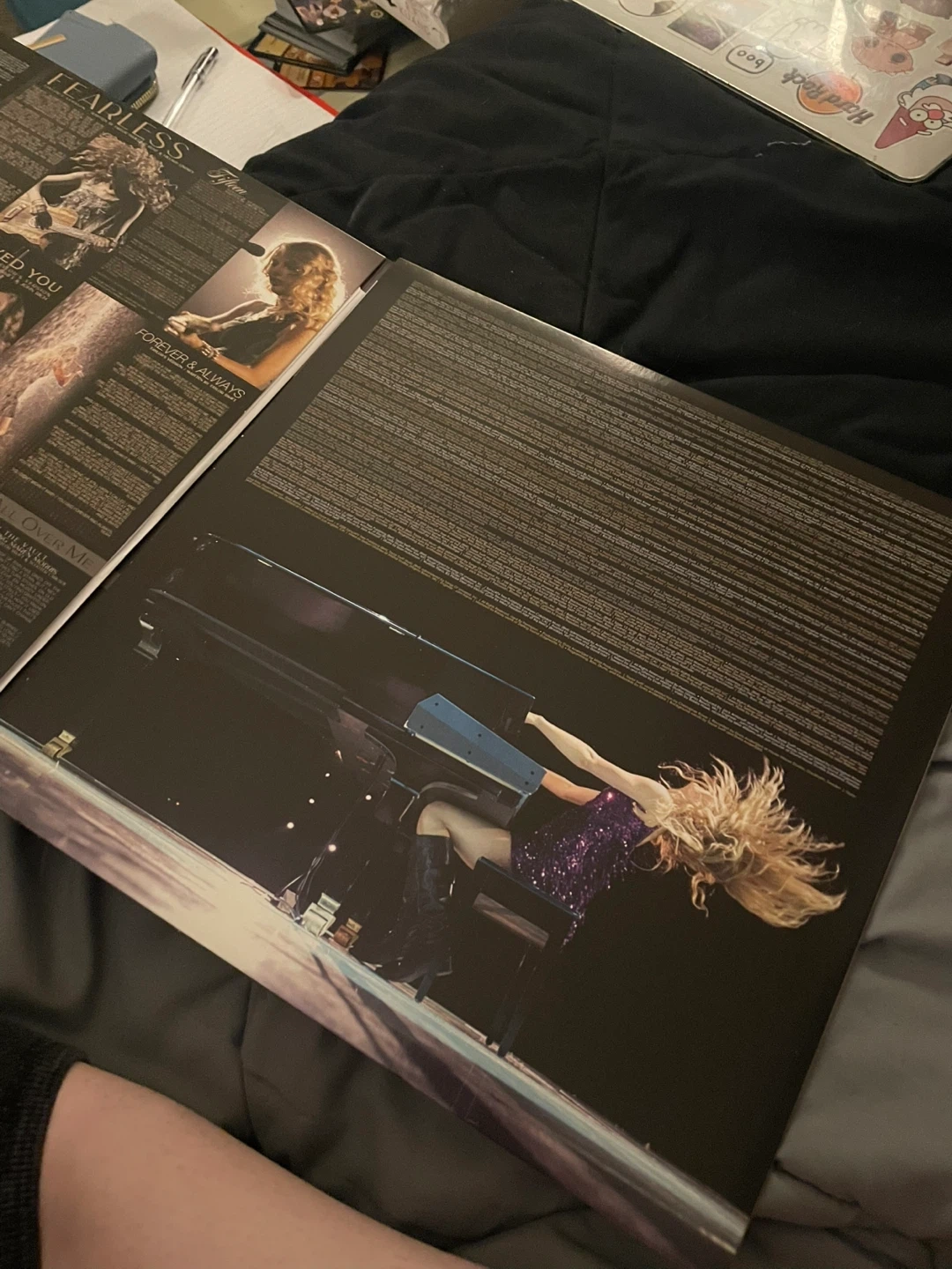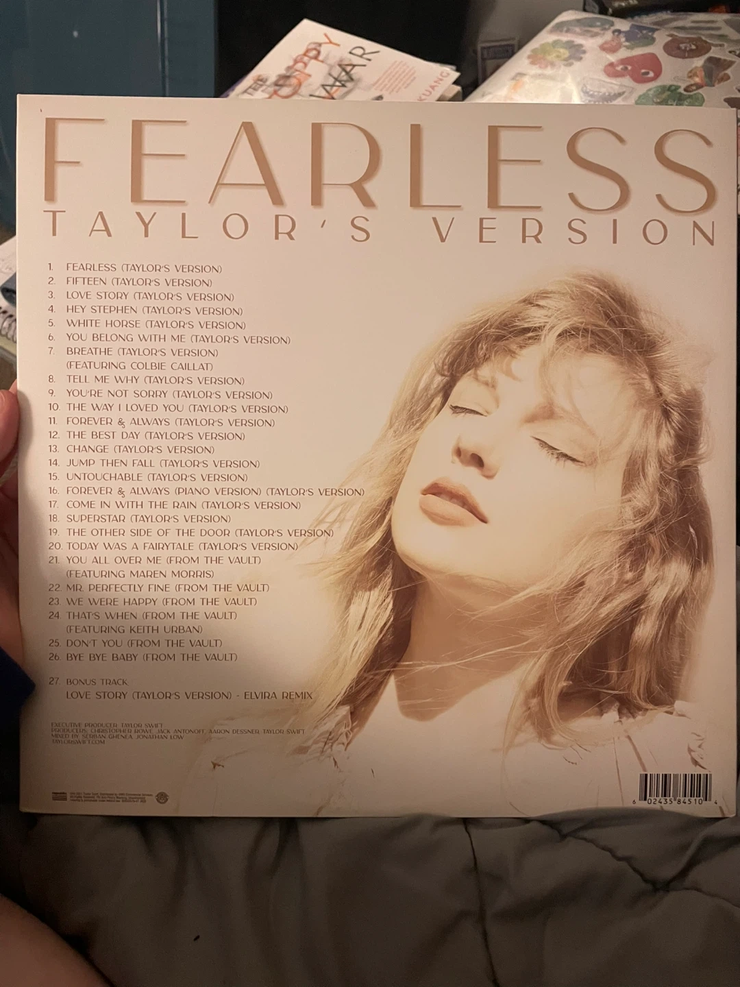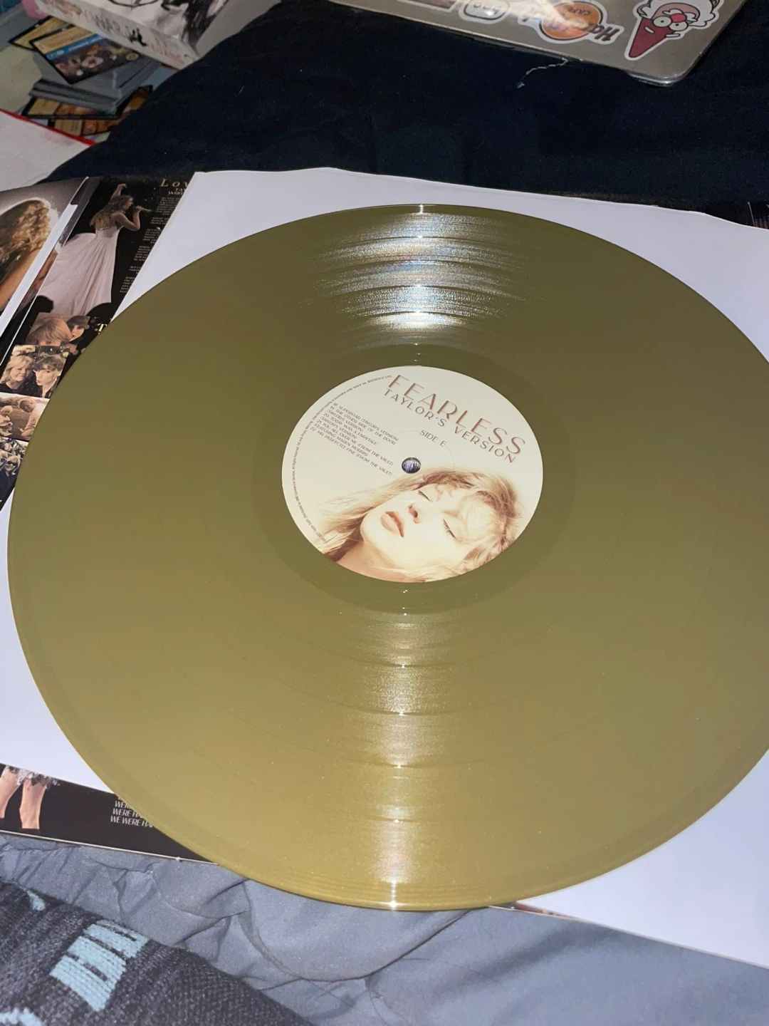 Taylor Swift's Fearless (Taylor's Version) vinyl record. It features the re-recorded tracks from her original album, plus vault tracks. 3 vinyls are included, all gold in colour. None of them have ever touched a needle.