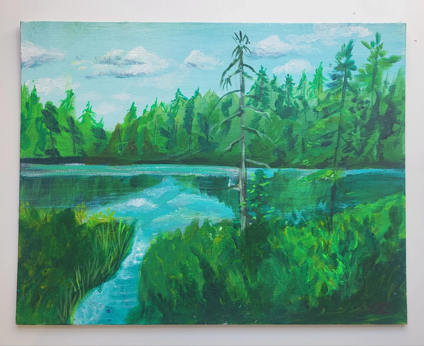 This is an acrylic painting on canvas depicting a serene forest landscape with a calm lake. It features vibrant greens and blues, with lush trees reflecting in the water. The artwork captures a peaceful wilderness view.