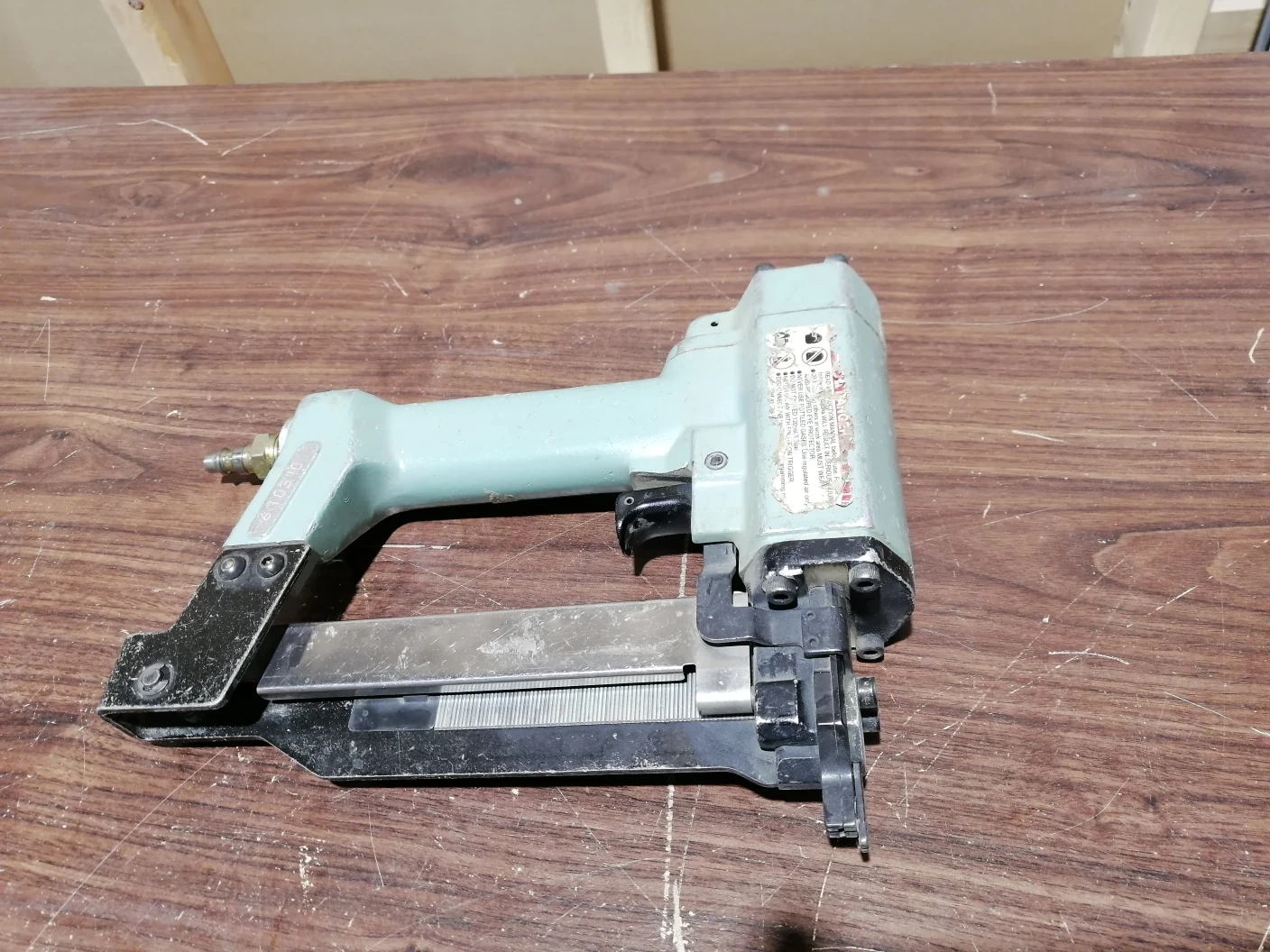 Used Hitachi pneumatic stapler. Shows wear from use. Great for upholstery or other projects. Model number visible in image.