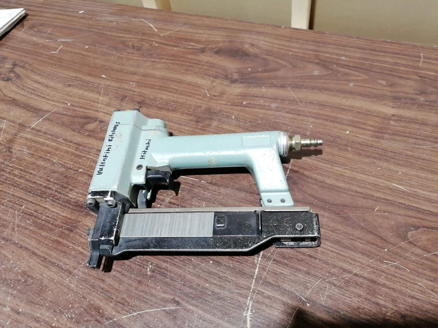 Used Hitachi pneumatic stapler. Shows wear from use. Great for upholstery or other projects. Model number visible in image.