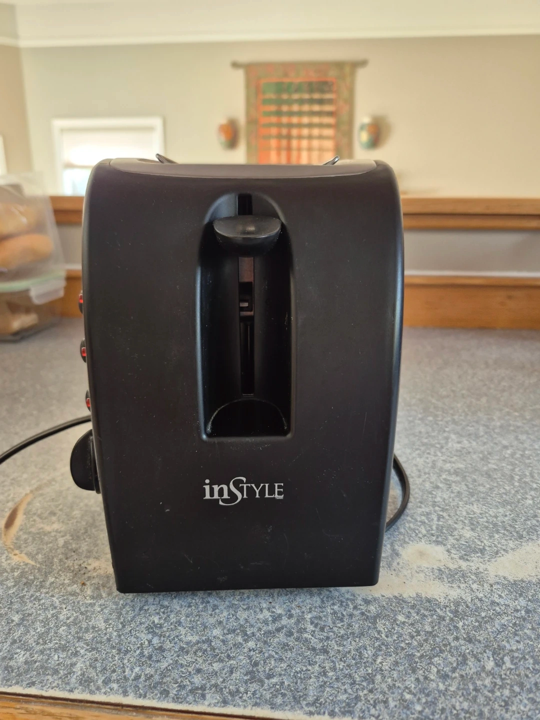 A black inSTYLE 2-slice toaster with stainless steel accents. It has variable browning settings and a crumb tray. Perfect for making toast in the morning!