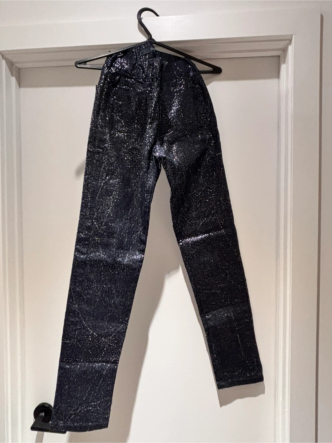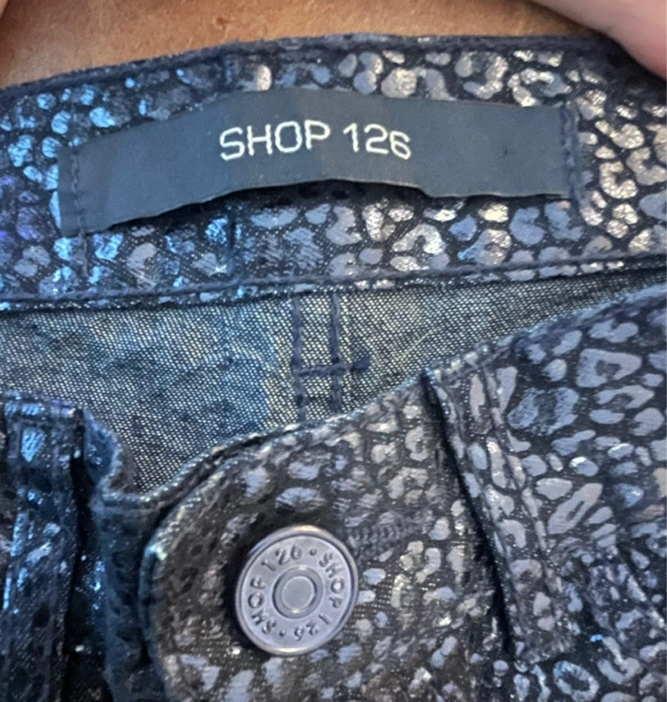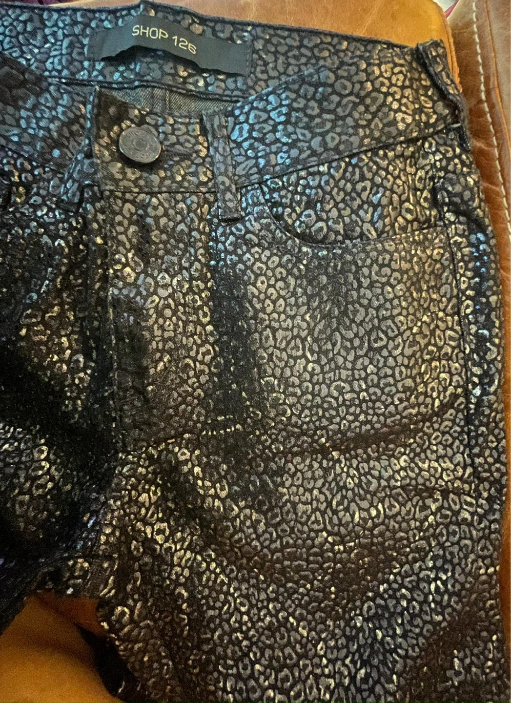 These pants have a cool navy blue and silver leopard print design. They're made with a stretchy material for a comfy fit. Great for adding some flair to your outfit!