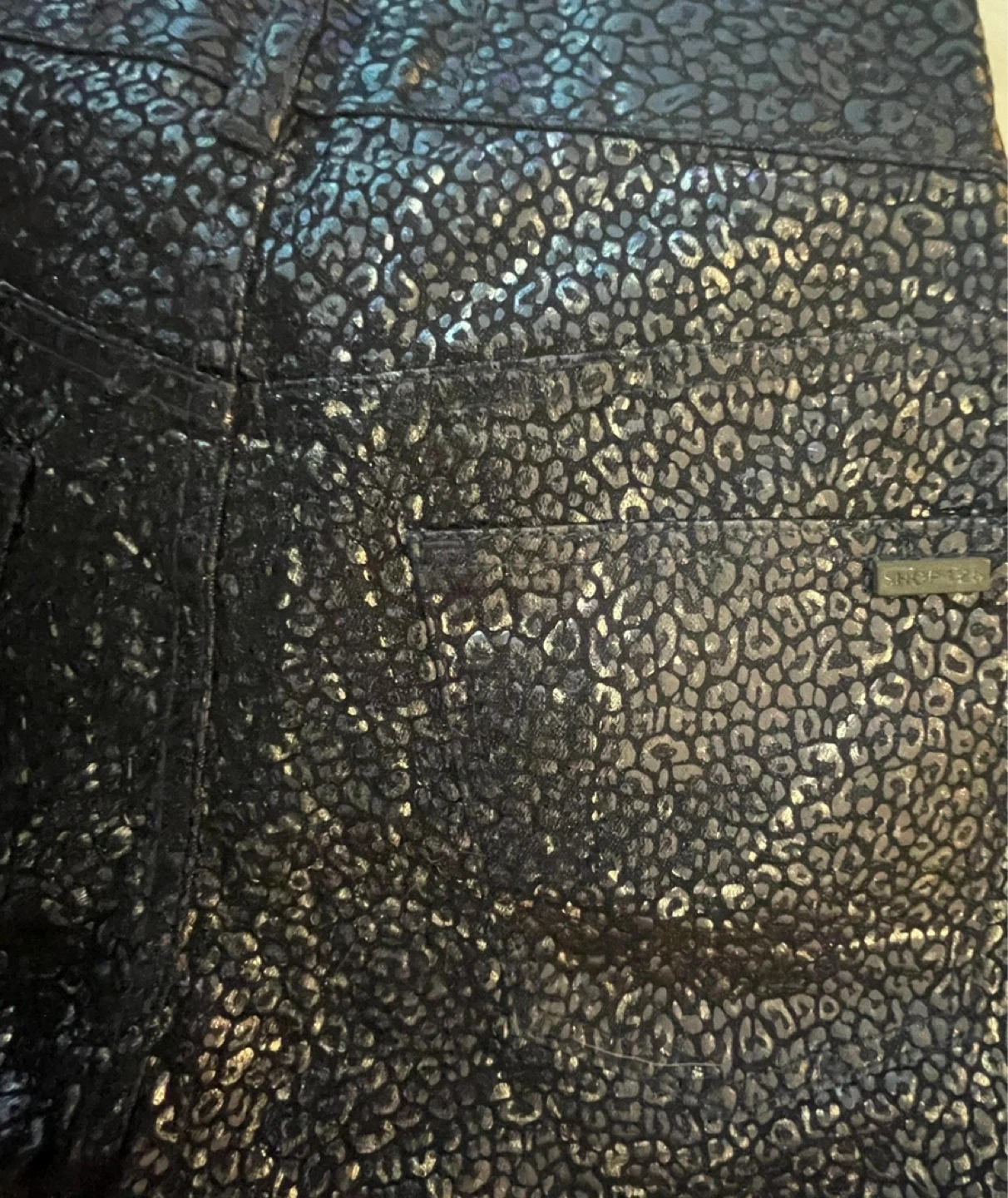 These pants have a cool navy blue and silver leopard print design. They're made with a stretchy material for a comfy fit. Great for adding some flair to your outfit!
