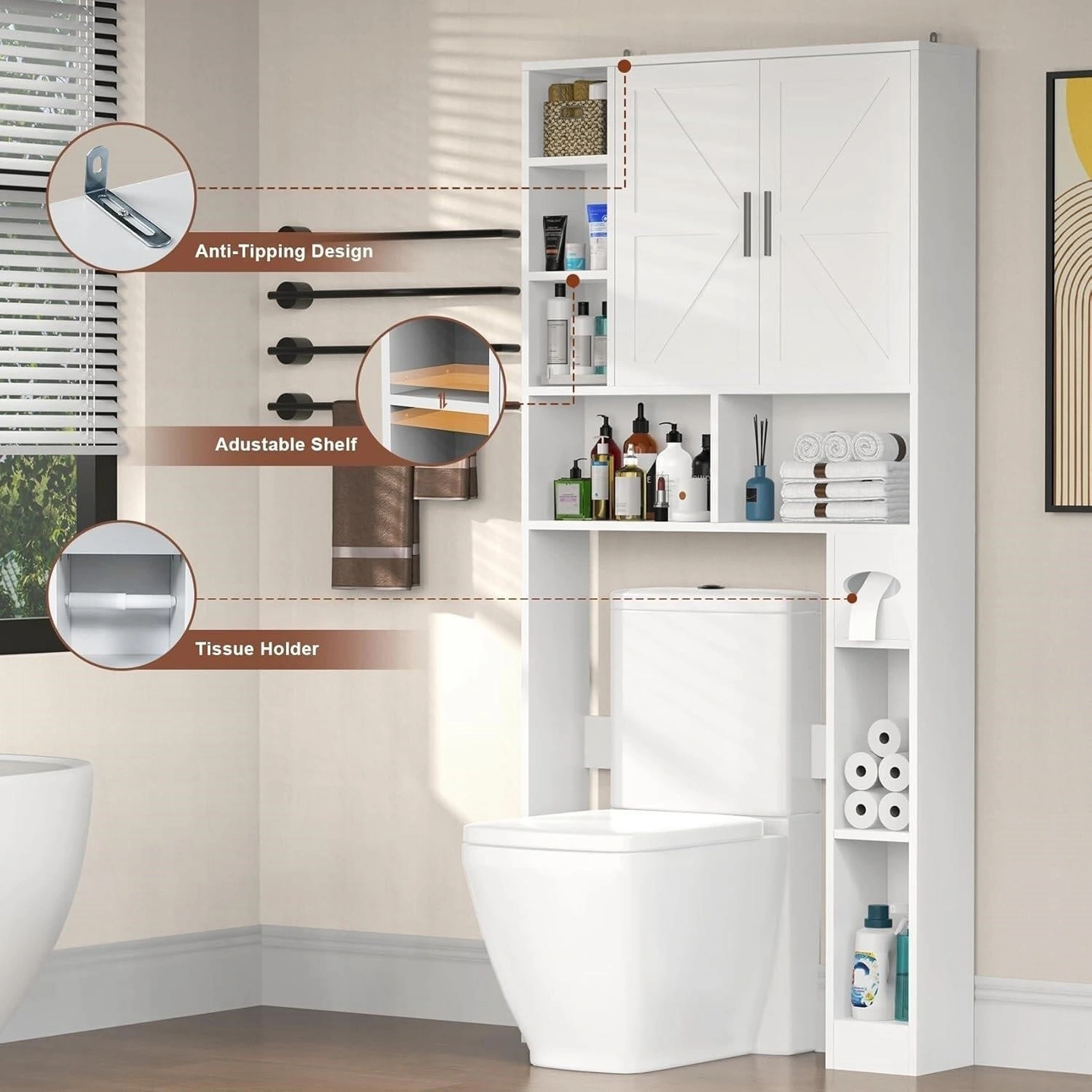 This white over-the-toilet storage cabinet is perfect for adding extra storage to your bathroom. It features an anti-tipping design and adjustable shelves, plus a convenient tissue holder. The dimensions are approximately 31.5" wide and 67.1" tall, so it should fit over most standard toilets!