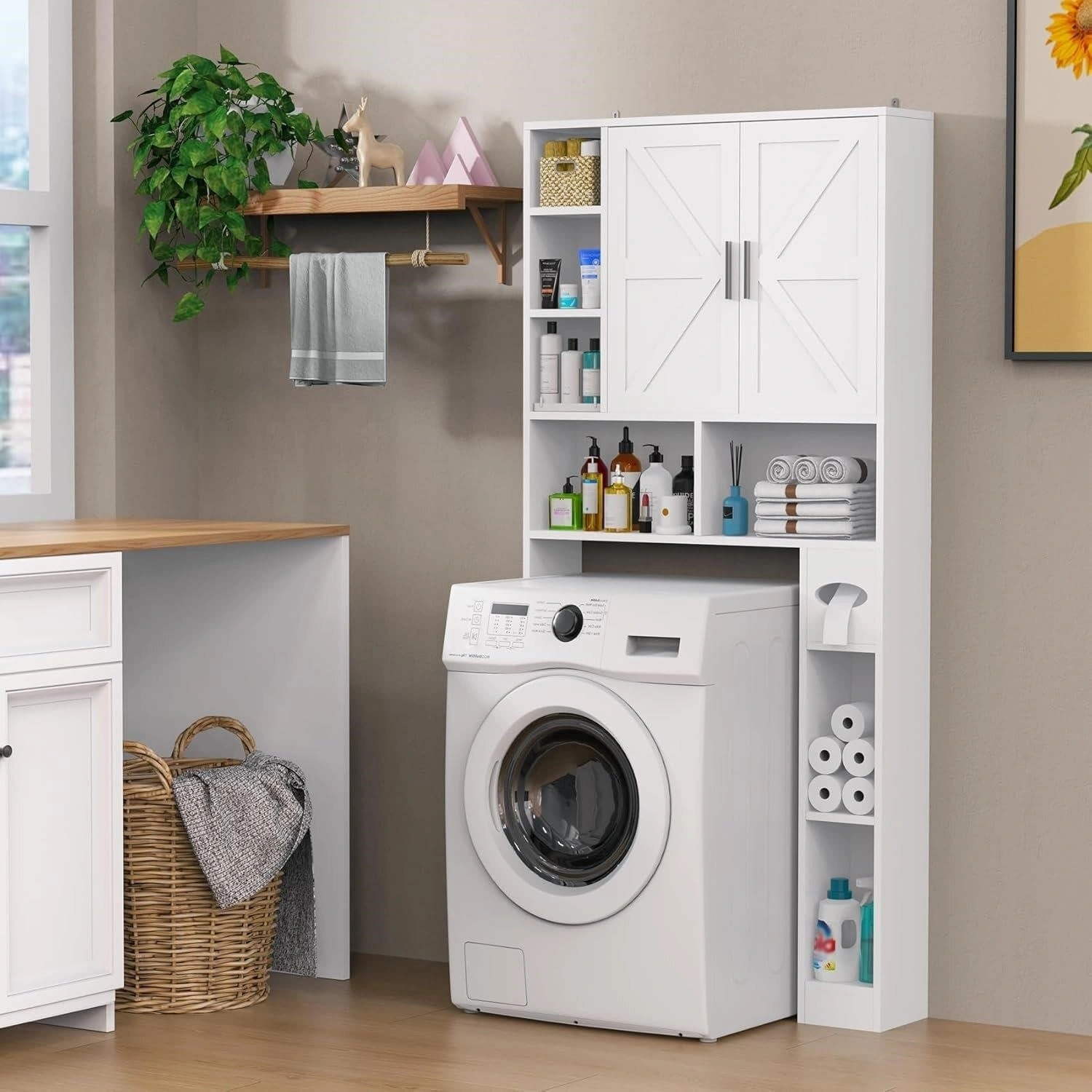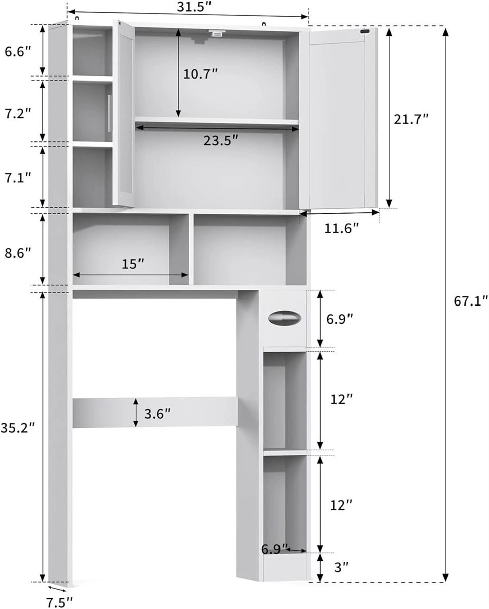 This white over-the-toilet storage cabinet is perfect for adding extra storage to your bathroom. It features an anti-tipping design and adjustable shelves, plus a convenient tissue holder. The dimensions are approximately 31.5" wide and 67.1" tall, so it should fit over most standard toilets!