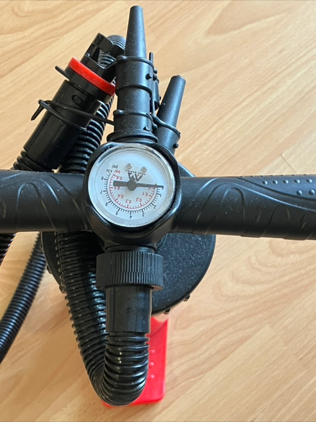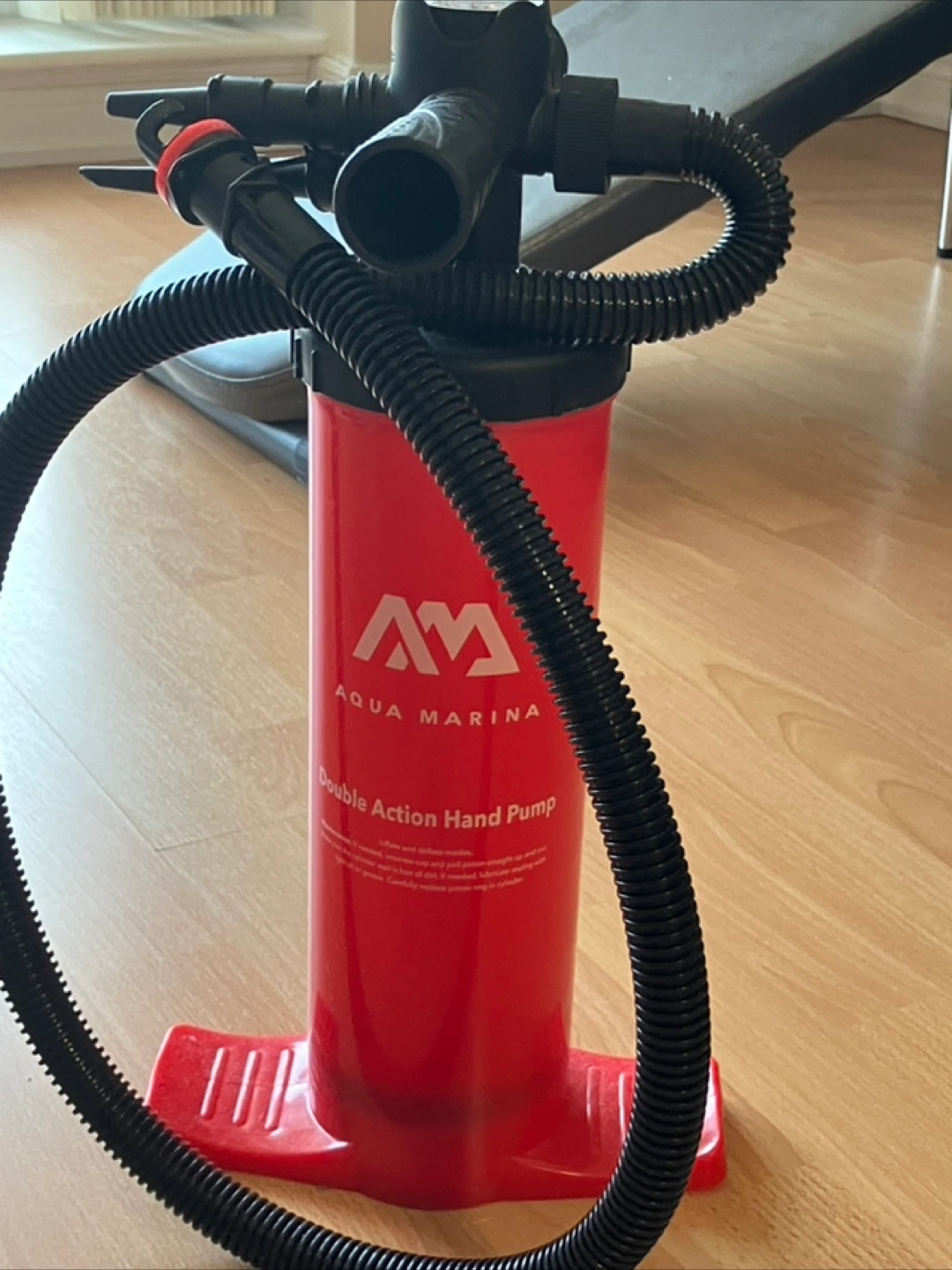 The AQUA MARINA Double Action Hand Pump is a high-performance inflator ideal for SUPs (Stand-Up Paddle Boards), inflatable kayaks, boats, air mattresses, and more. Designed with a double action mechanism, it pumps air both when you push and pull, making inflation faster and more efficient.