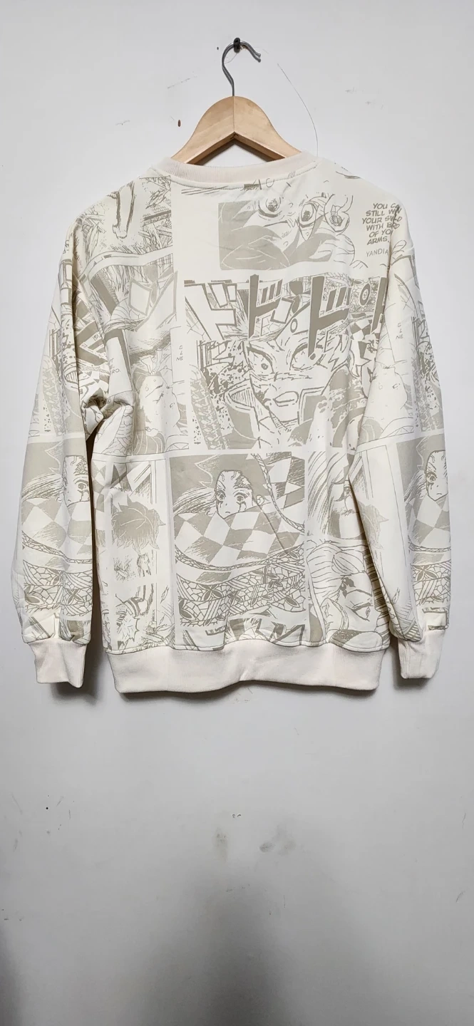 Cream coloured crewneck sweater with a graphic manga print. It's a comfortable pullover style. Crewneck, long sleeves, and ribbed cuffs and hem.