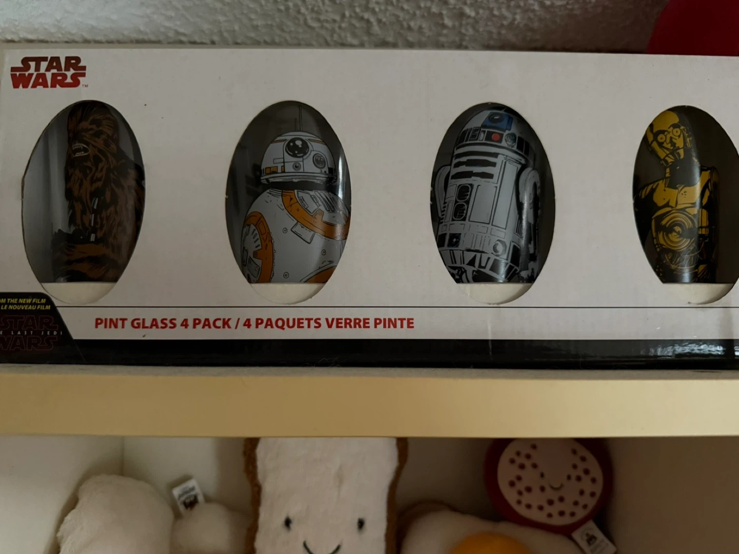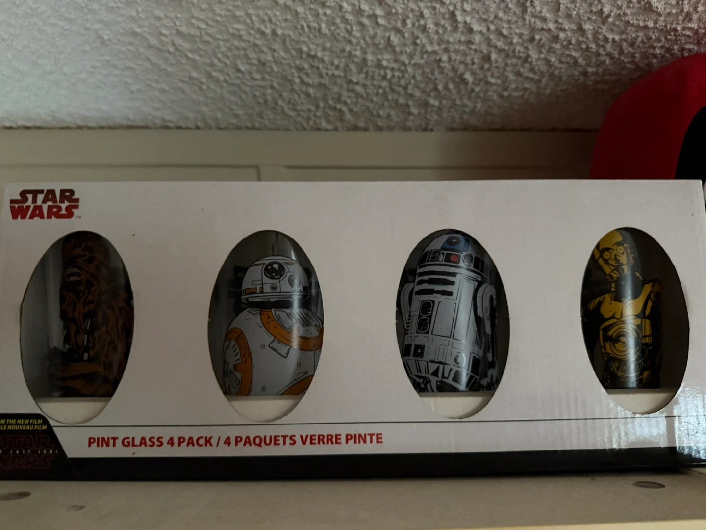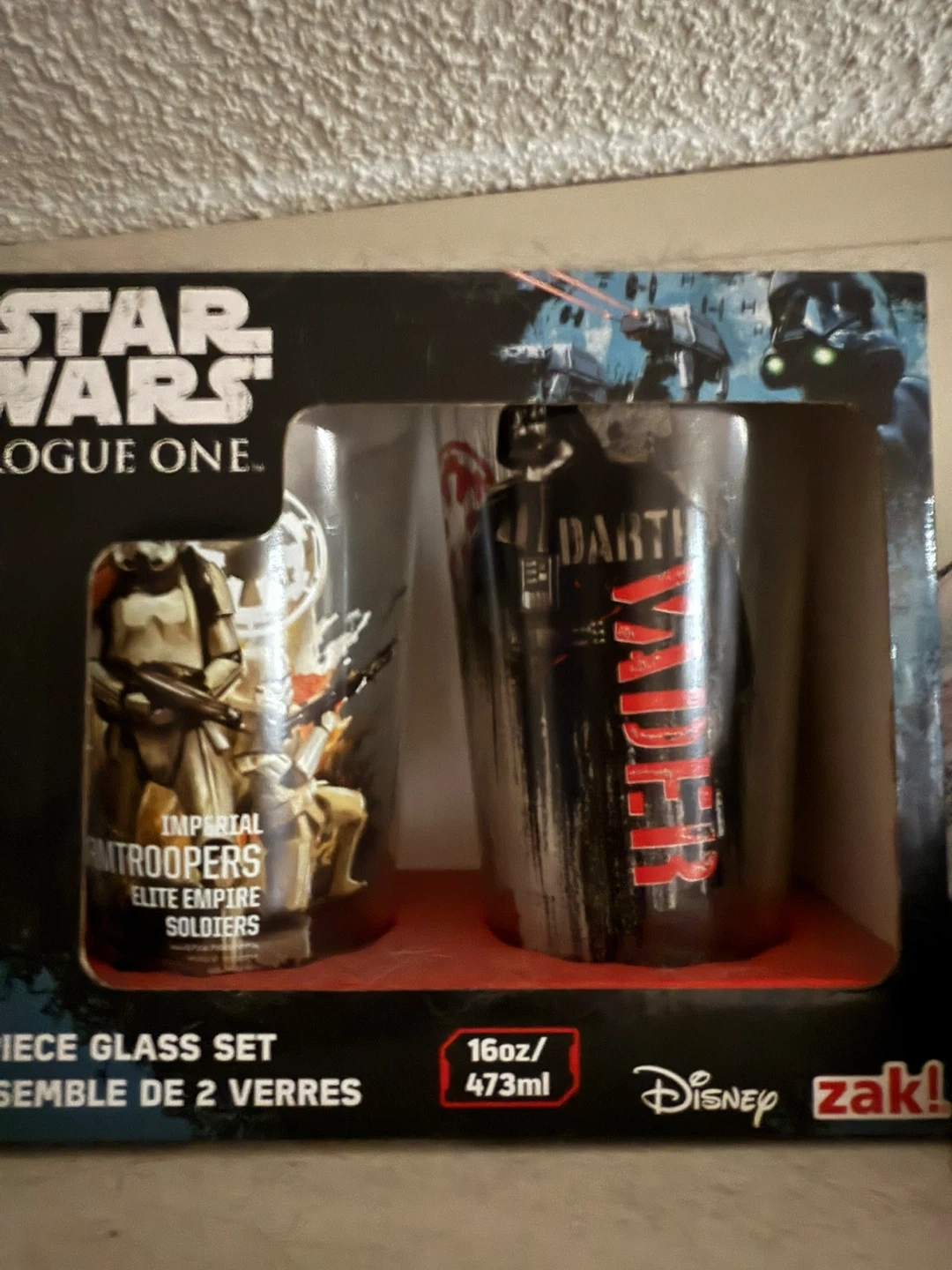 Includes a 2-piece Star Wars Rogue One glass set and a 4-piece Star Wars pint glass pack. The Rogue One set features Imperial Stormtroopers and Darth Vader, each glass is 16oz/473ml. The pint glass set includes Chewbacca, BB-8, R2-D2, and C-3PO. These glasses are perfect for any Star Wars fan!