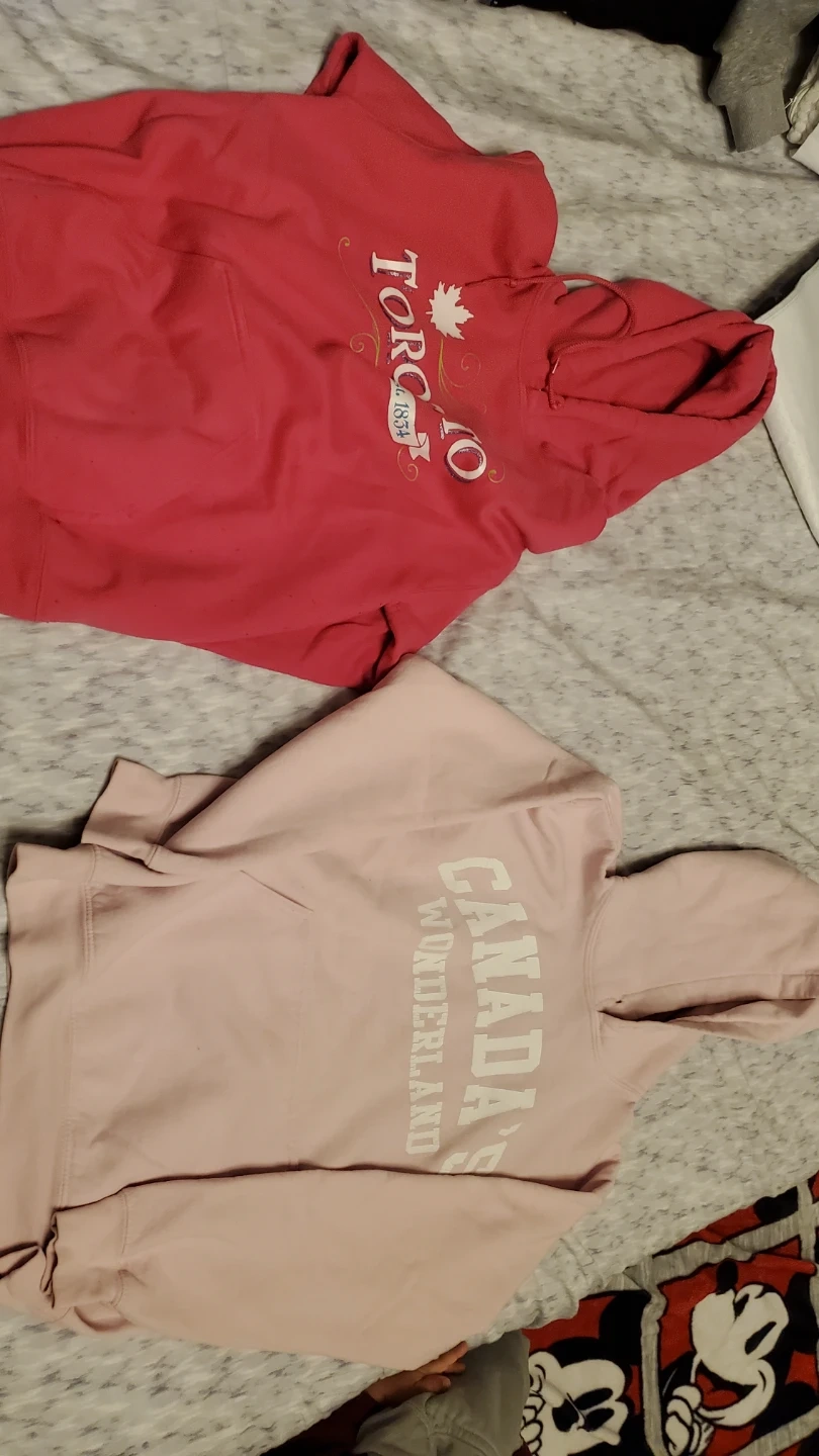 Selling two hoodies! One is a bright pink Toronto hoodie and the other is a light pink Canada's Wonderland hoodie. Both are in good condition!
