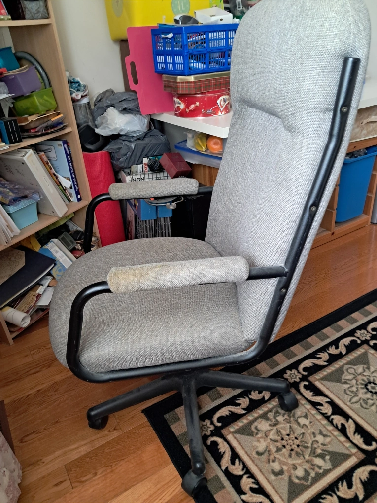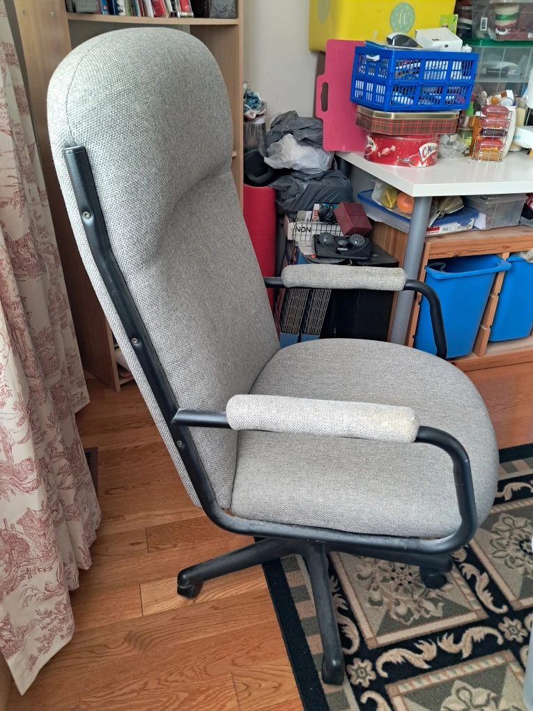 Selling a comfortable grey office chair. It's in good condition and perfect for your home office or study space. The chair features a high back for good support and armrests for added comfort