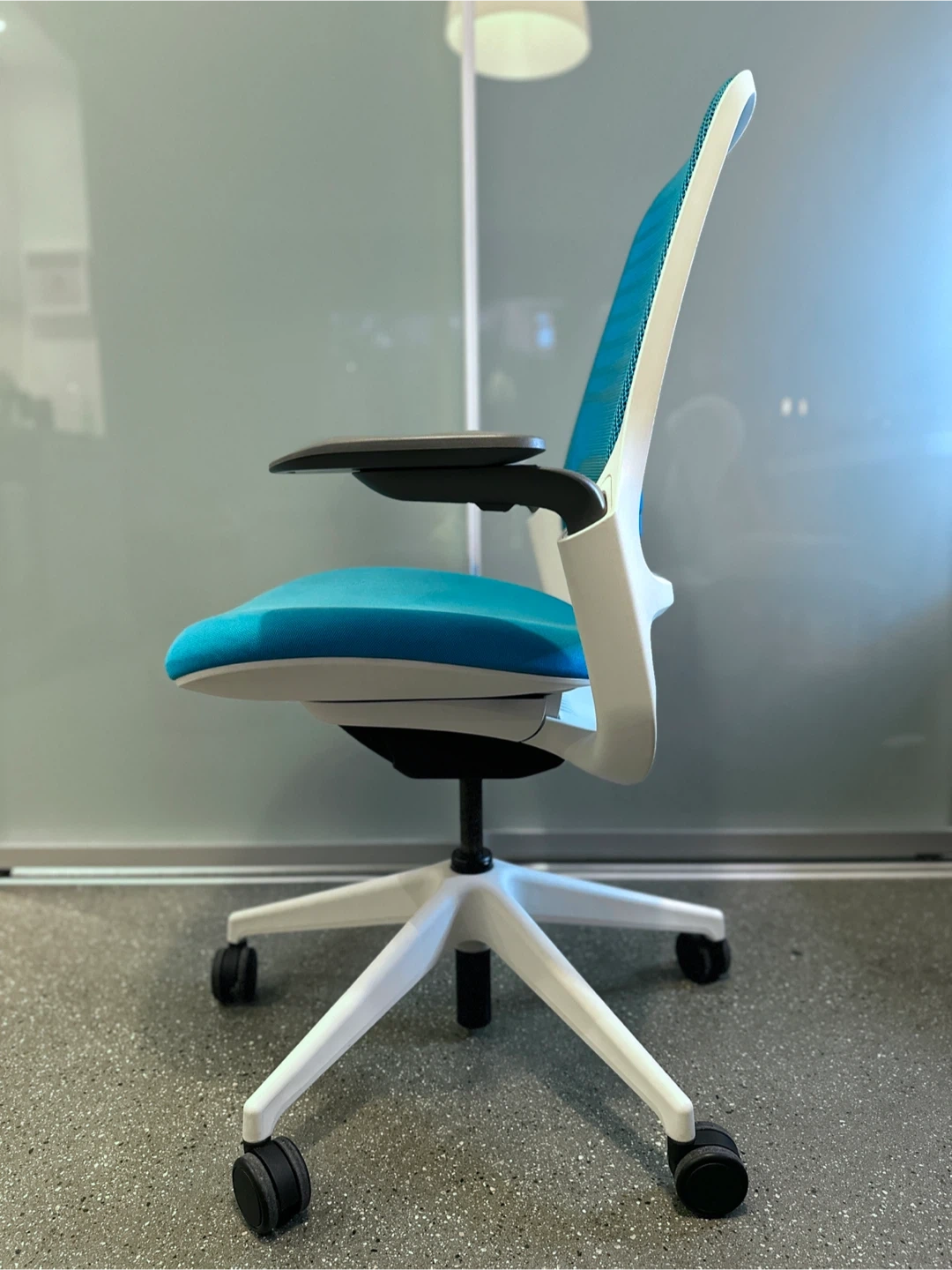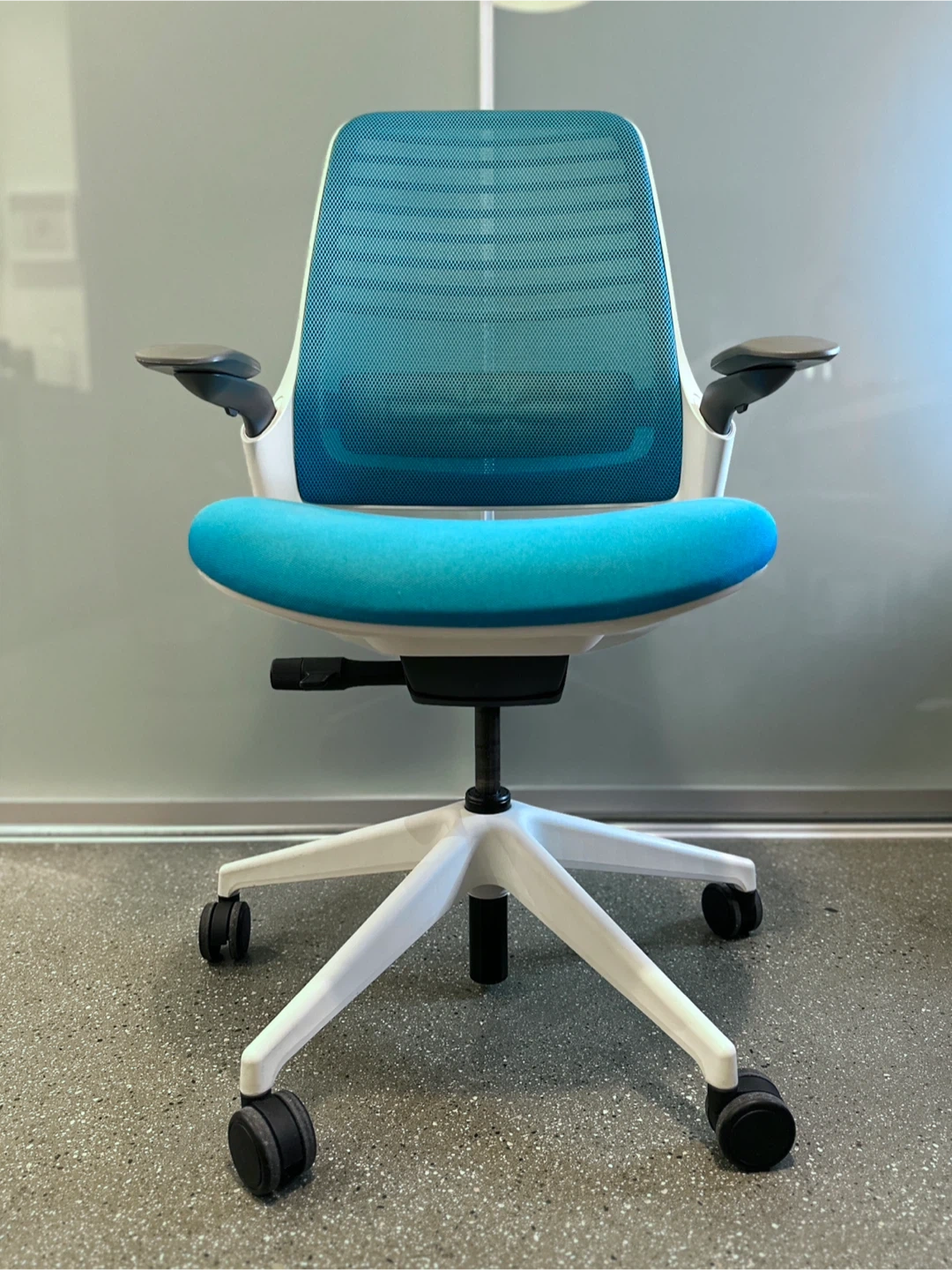Selling my Steelcase Series 1 office chair in white frame with limited edition cyan fabric. This is a high-quality, ergonomic task chair from Steelcase — super comfortable, durable, and designed for all-day sitting.