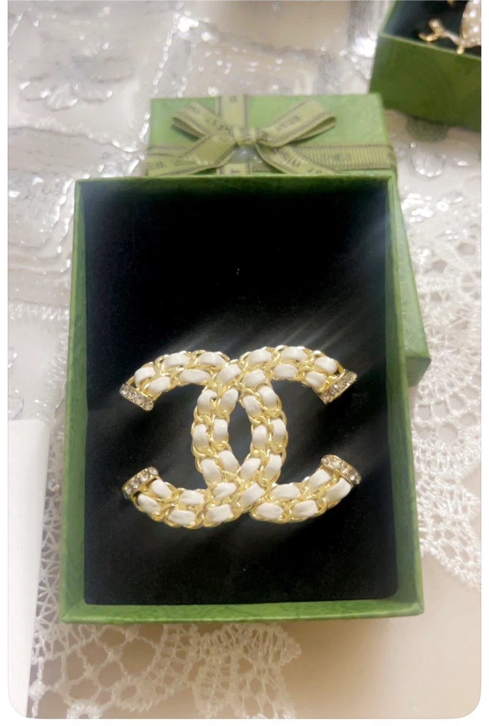 This is a Chanel CC logo brooch. It's gold-tone with white chain detailing and small crystal accents. Comes in its original box!