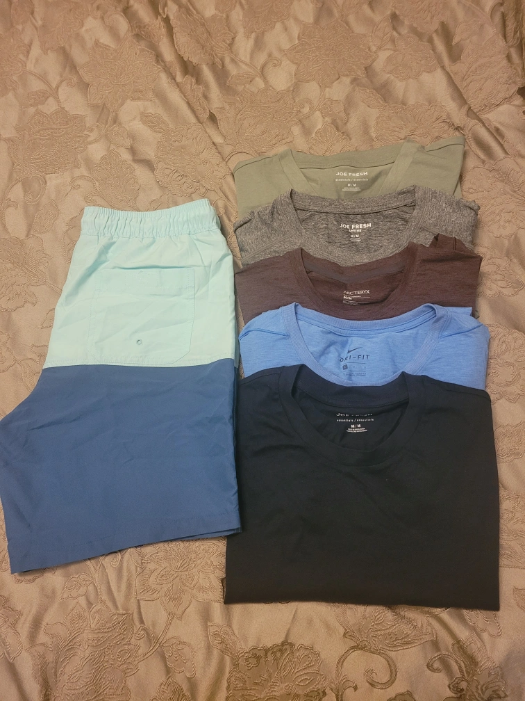 Three men's Joe Fresh T-shirts, one Nike (size L) and one Arc'teryx, assorted colours and one pair of swim trunks. Size medium for shirts, shorts is Small. All 6 for $10.